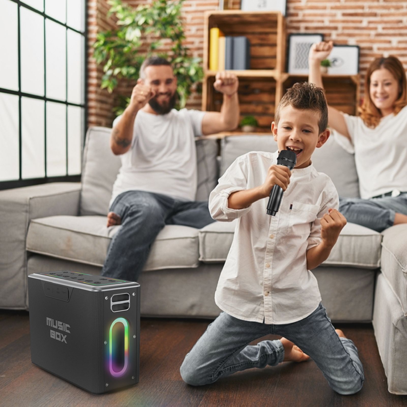 Чотири динаміка сумарною потужністю 100W, система караоке з двома мікрофонами та динамічна RGB-підсвітка.