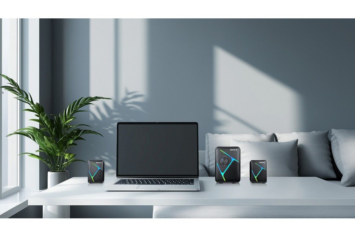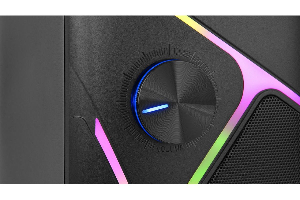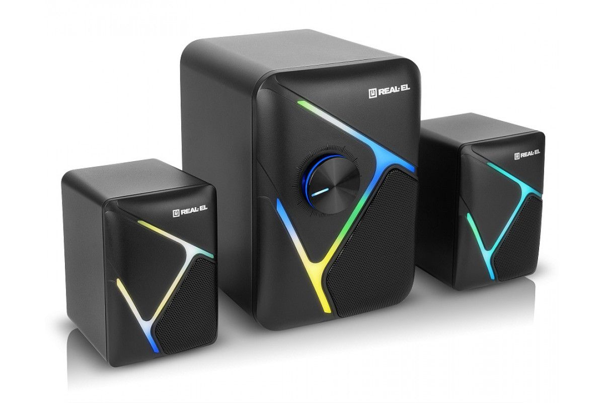 REAL-EL M-320 має яскраве RGB підсвічування, яке додає стилю та створює незабутню атмосферу під час прослуховування. Регулятор гучності з підсвічуванням розташований на передній панелі сабвуферної, що дозволяє швидко і легко налаштувати звук під ваші потреби.