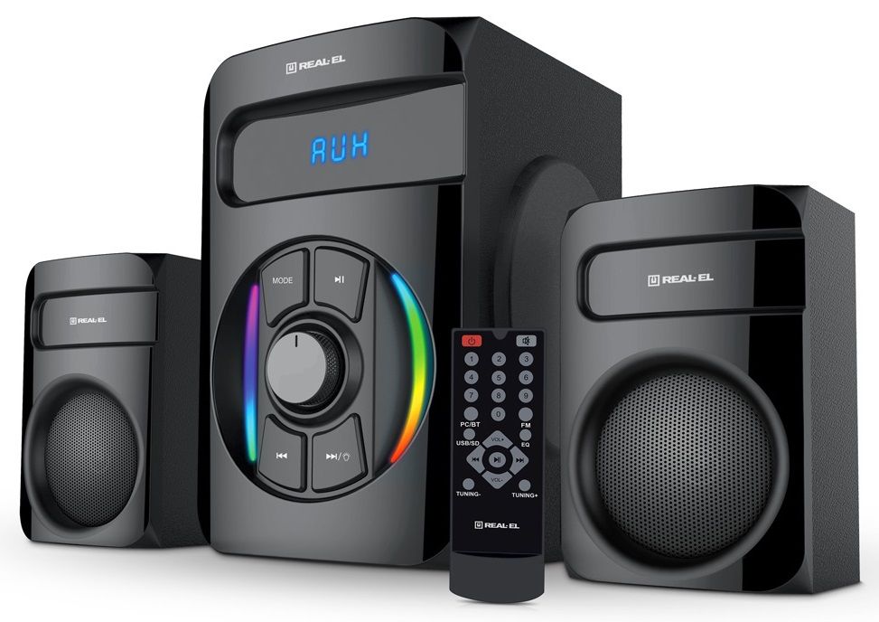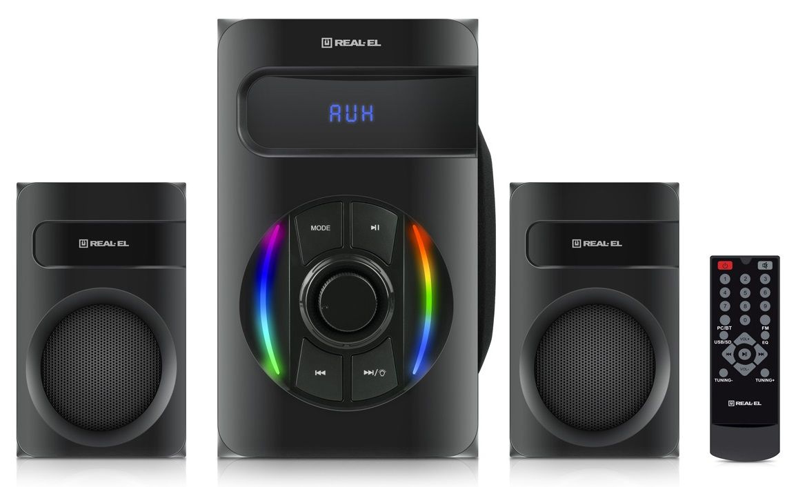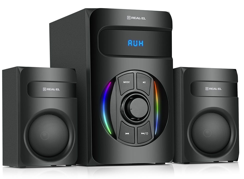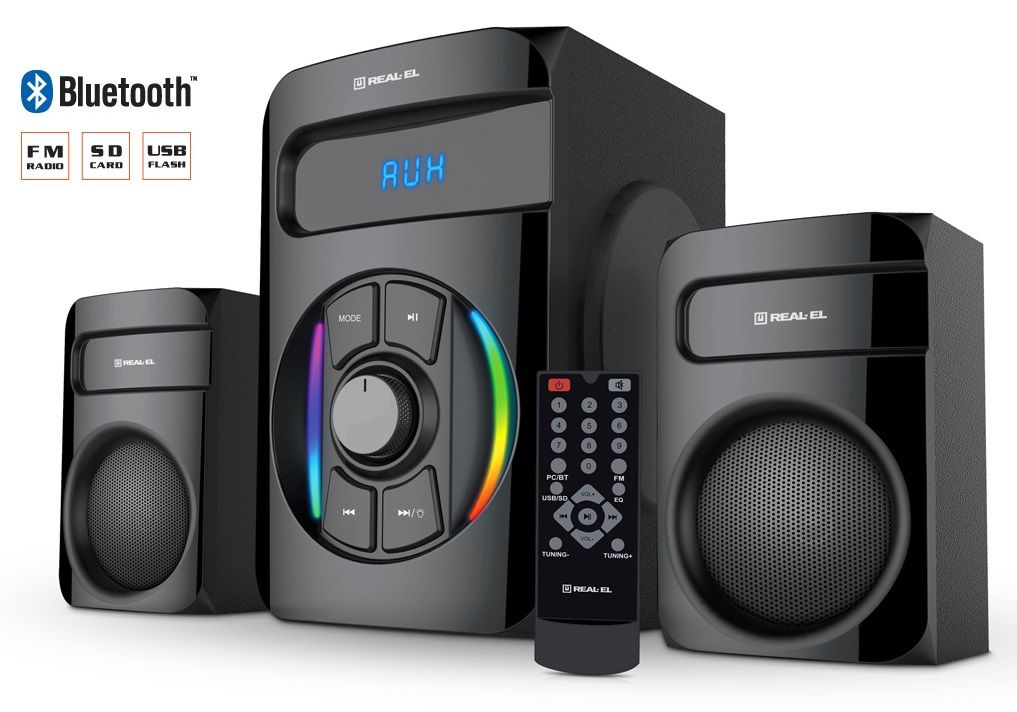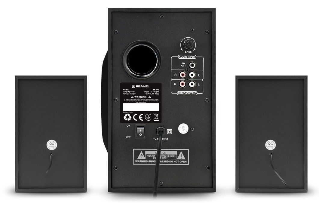 Акустична система REAL-EL M-375 призначена для відтворення музики та озвучування ігор, фільмів тощо. АС може бути підключена практично до будь-яких джерел аудіосигналу (CD/DVD-програвачів, телевізора, телефона, ПК тощо) без використання додаткового підсилювача потужності. АС має вмонтовані FM-радіо, Bluetooth-модуль і програвач аудіофайлів USB Flash, SD Card.