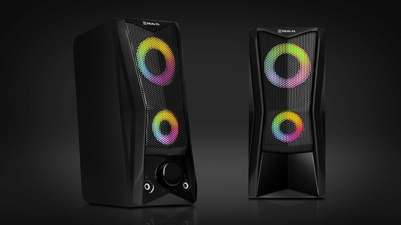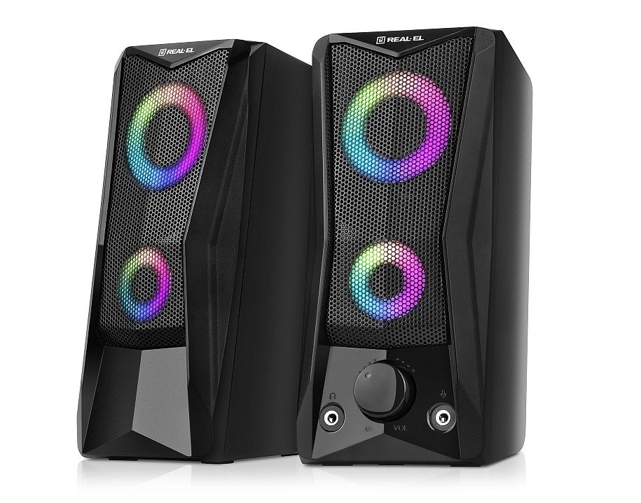 REAL-EL S-107 має зручний регулятор гучності та додаткові роз’єми для підключення навушників та мікрофона. Яскраве підсвічування надає динамічності та створює приємну атмосферу під час роботи на комп’ютері чи відпочинку з улюбленою музикою.