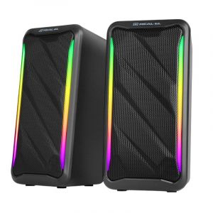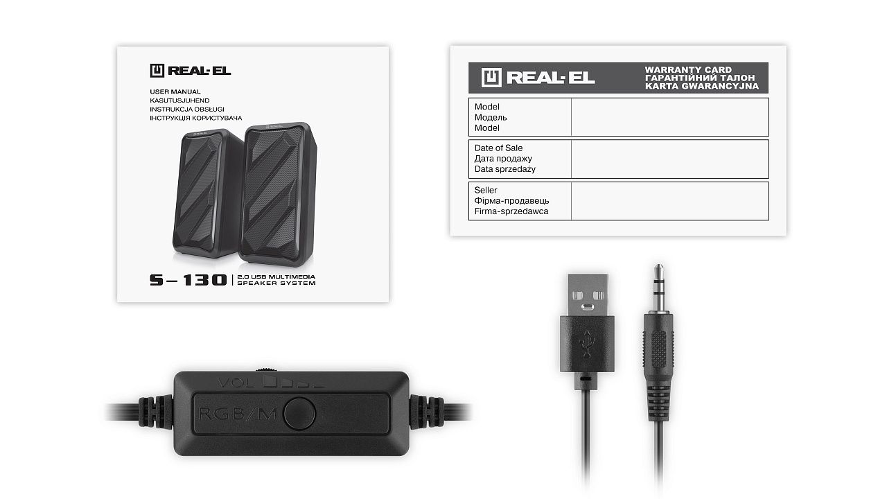 Мультимедійна акустична система REAL-EL S-130 – це легке та доступне рішення для озвучування комп’ютера чи ноутбука. АС оснащена вбудованим підсилювачем та акустичним кабелем, тому її можна швидко підключити практично до будь-яких джерел аудіосигналу. Живлення здійснюється через USB-порт ПК, ноутбука або через блок живлення 5V DC за допомогою вбудованого кабелю USB.