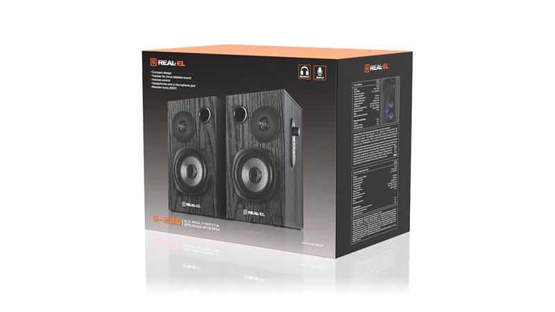 Мультимедійна акустична система REAL-EL S-235 – легке й доступне вирішення питання озвучування комп’ютера (ноутбука). АС оснащена вмонтованим підсилювачем, акустичним та сигнальним кабелями, завдяки чому може бути підключена практично до будь-яких джерел аудіосигналу.