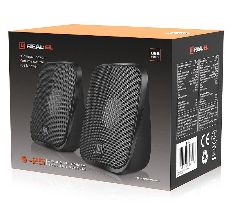 REAL-EL S-25 - стильне та практичне рішення для щоденного використання. Мультимедійна акустична система REAL-EL S-25 – компактне та доступне рішення для озвучування комп’ютера чи ноутбука. Завдяки покращеній формі корпусу з вишуканим дизайном акустика не лише гармонійно виглядає на робочому столі, а й забезпечує найкращі акустичні властивості.