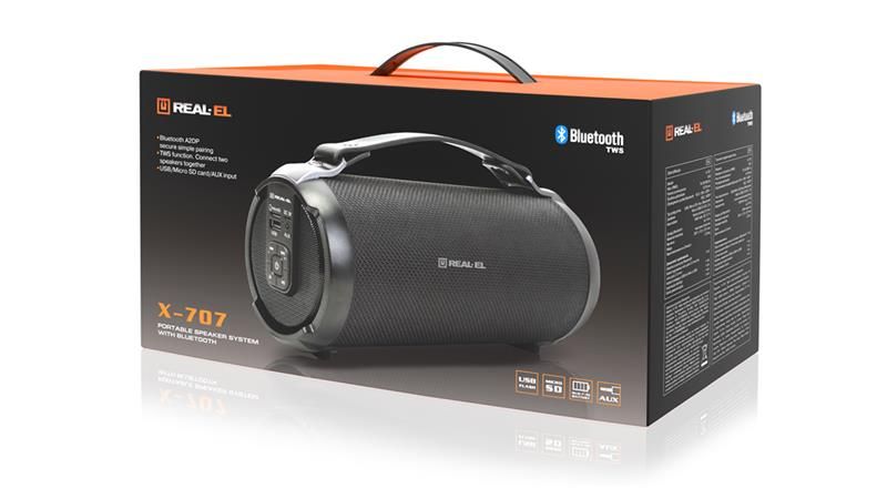Мультимедійна портативна акустична система REAL-EL X-707 має сучасний дизайн і якісне звучання. REAL-EL X-707 стильний і компактний бумбокс з функцією TWS.