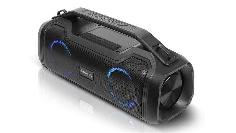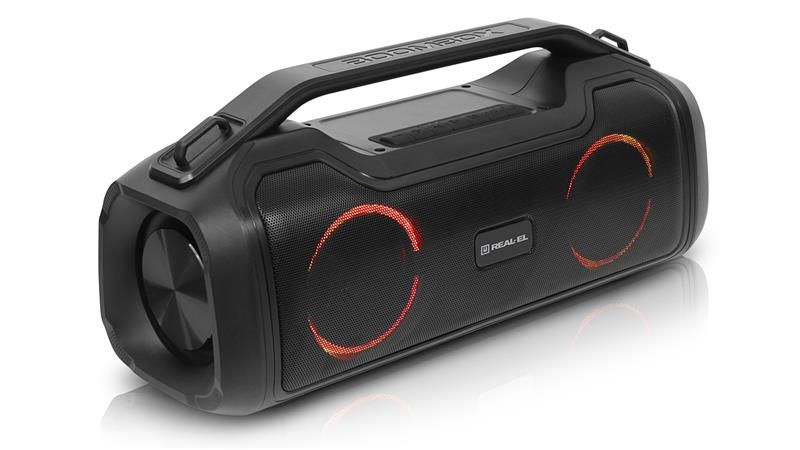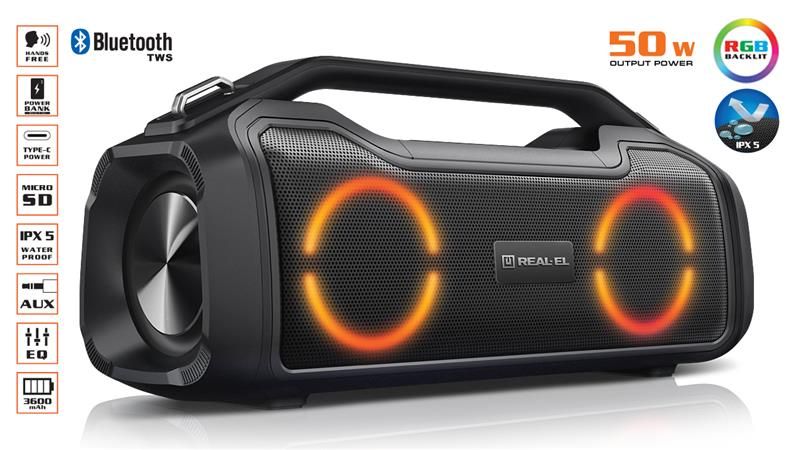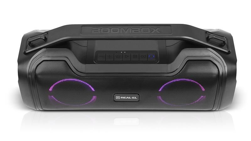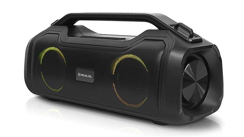 REAL-EL X-747 це стильний, потужний бумбокс з RGB підсвічуванням, функцією TWS та вбудованим еквалайзером.