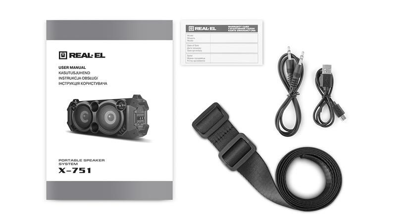 Мультимедійна портативна акустична система REAL-EL X-751 має сучасний дизайн та якісне звучання. Широкий функціонал "бумбокса" дозволяє прослуховувати музику підключаючи мобільний пристрій, ПК, TV, ноутбуки і т. п., як через вивід AUX, так і по Bluetooth. USB і Micro SD card роз'єми дають можливість прослуховувати аудіо-файли з flash носіїв. X-751 відмінний супутник для відпочинку на природі, літій-іонний акумулятор на 4000 mAh забезпечить вас музикою на вельми тривалий час.
