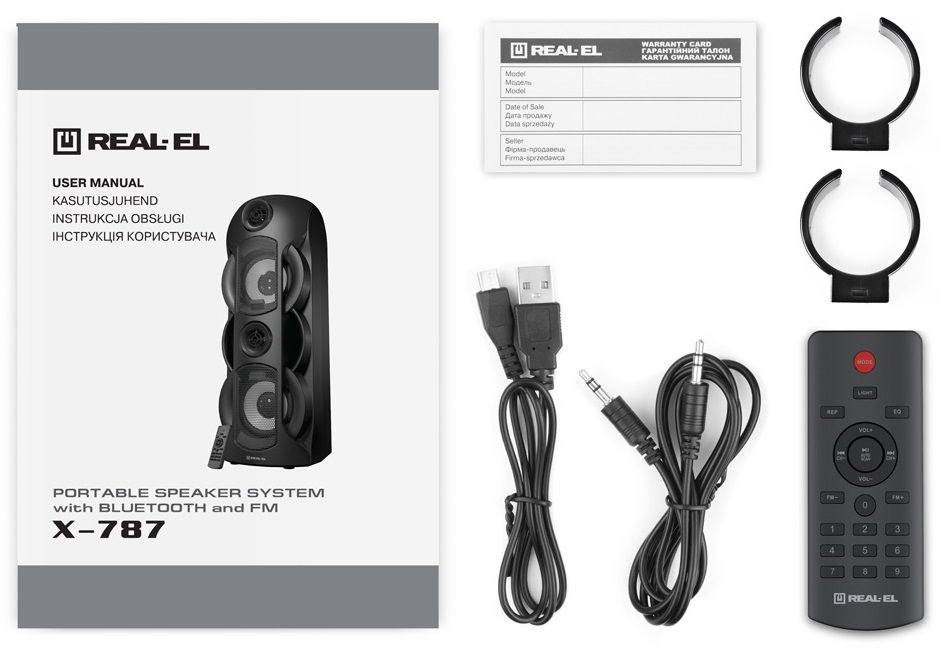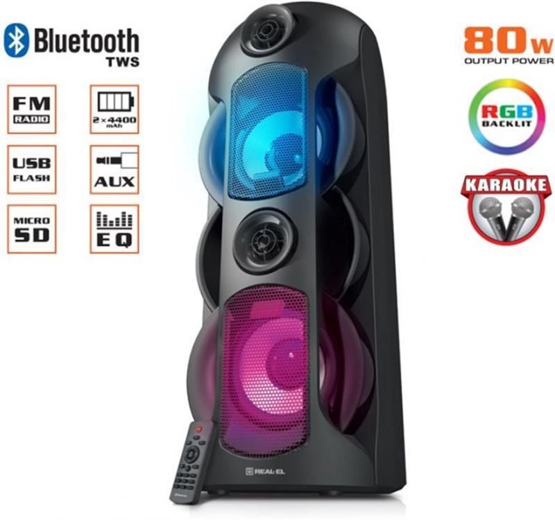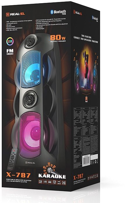 Мультимедійна портативна акустична система REAL-EL X-787 має сучасний дизайн з RGB підсвічуванням і якісним потужним 80-ти Ватт-ним звучанням. Широкий функціонал "бумбокса" дозволяє прослуховувати музику підключаючи мобільні пристрої, ПК, TV, ноутбуки і т. д., як через вивід AUX, так і по Bluetooth. USB і Micro SD card роз'єми дають можливість прослуховувати аудіо-файли з flash носіїв.