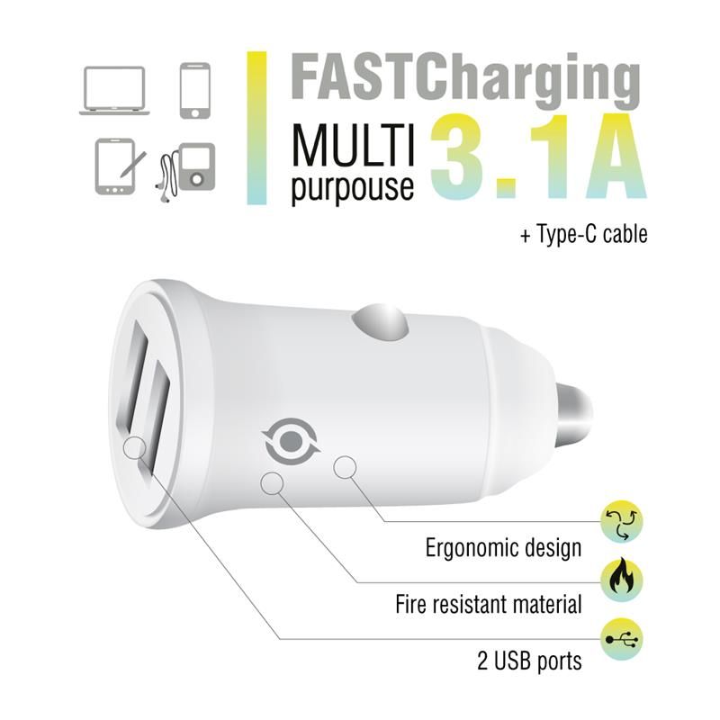 Автомобільний зарядний пристрій Piko CC-312 (2USB, 3.1A) White + кабель Type-C (1283126538803)