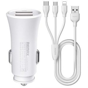 Автомобільний зарядний пристрій Remax (2xUSB, 2.4A) White (6954851288206) + кабель Lightning/microUSB/Type-C