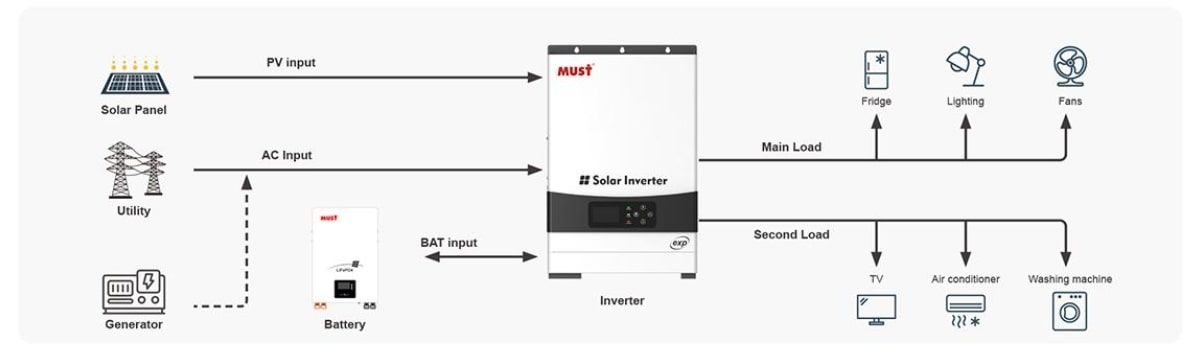 Об’єднання сонячної системи, мережі змінного струму та джерела живлення від акумулятора для забезпечення безперервного живлення.