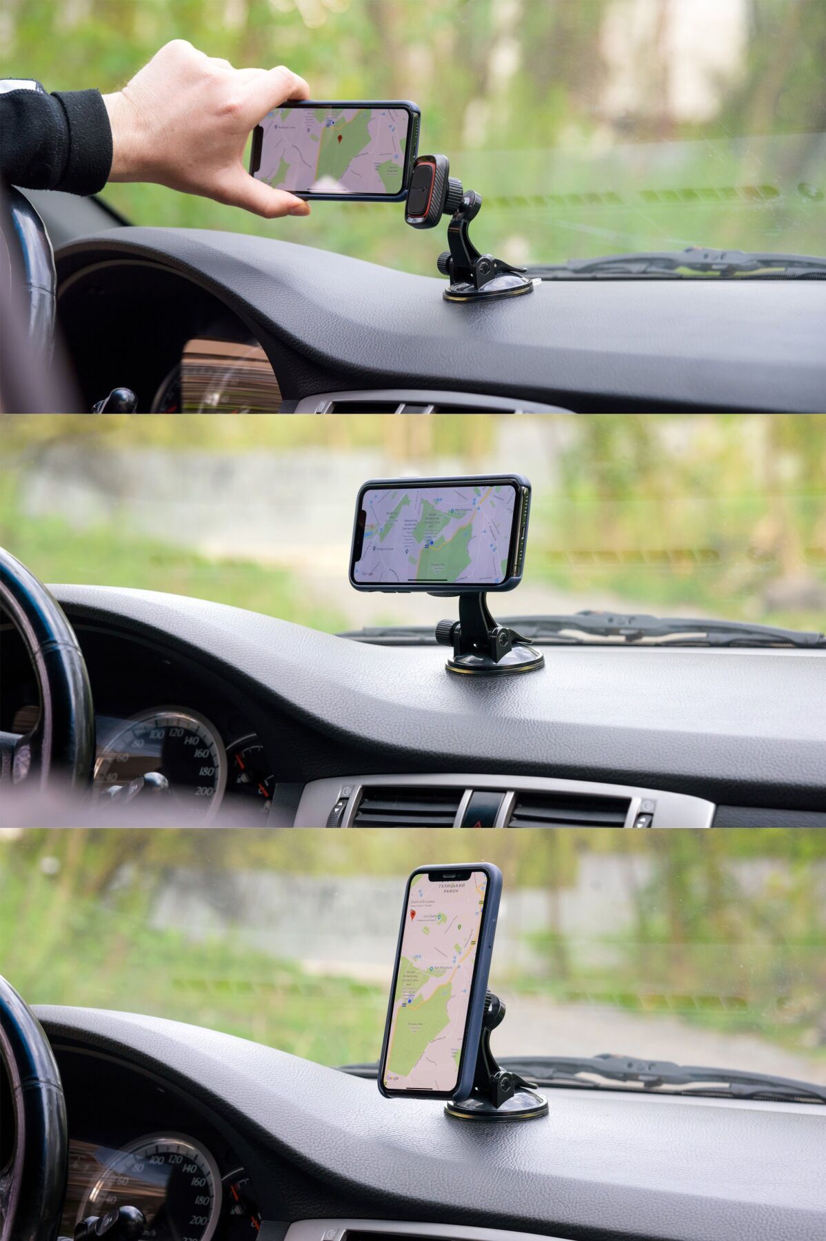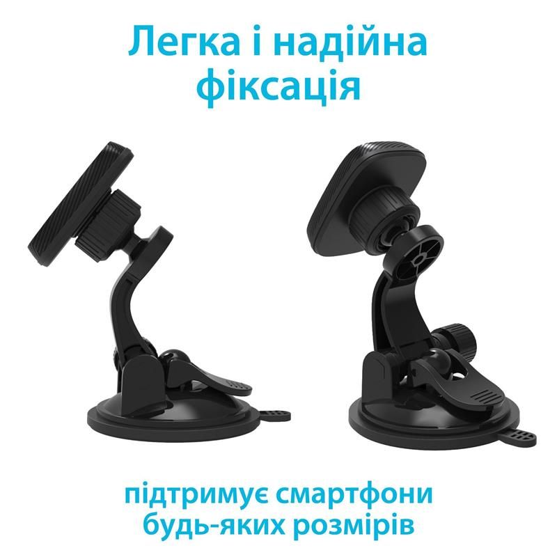 Максимально легка установка: кріплення просто встановлюється в максимально зручне місце на лобовому склі або панелі автомобіля, і фіксується присоскою з затискачем і гелевою клейкою основою