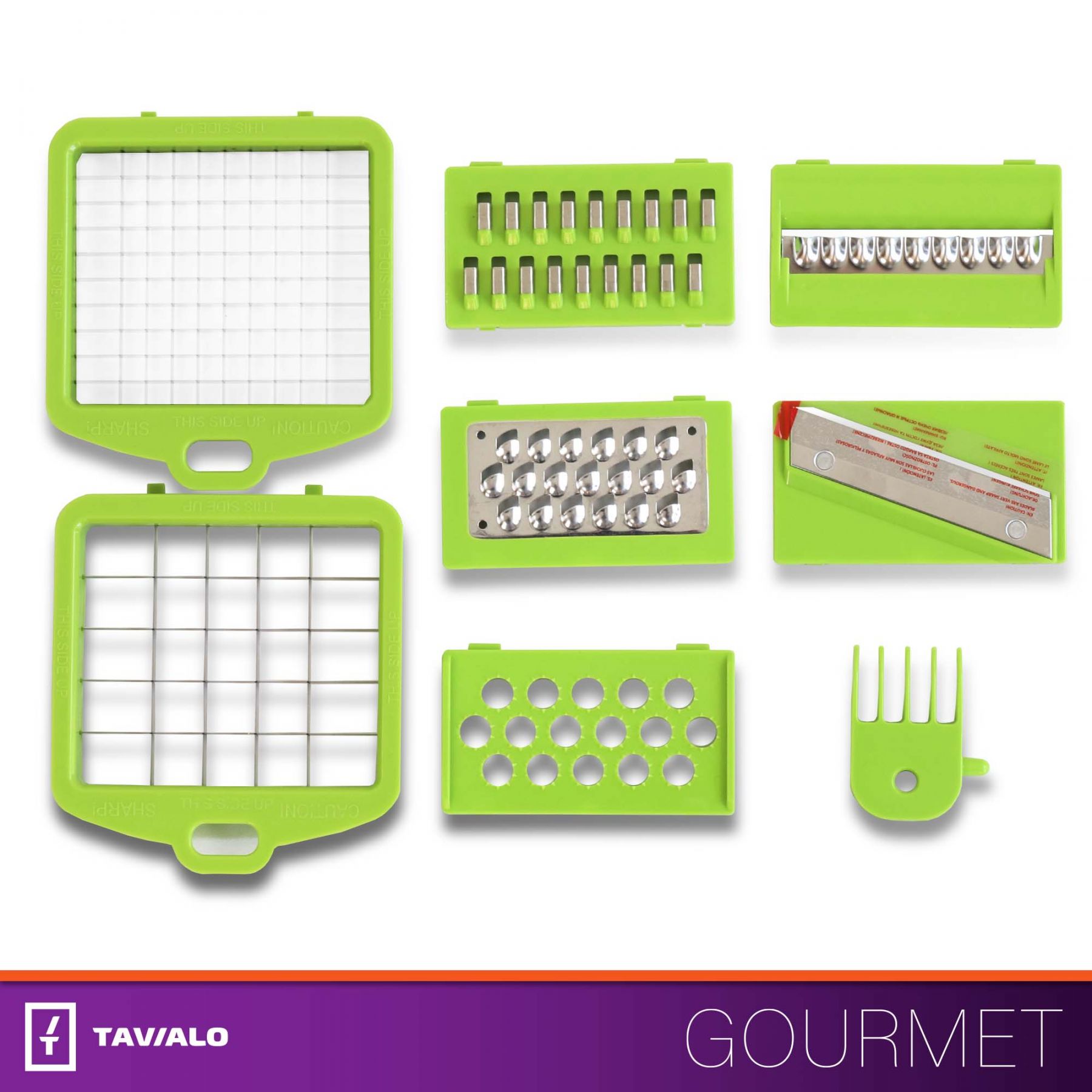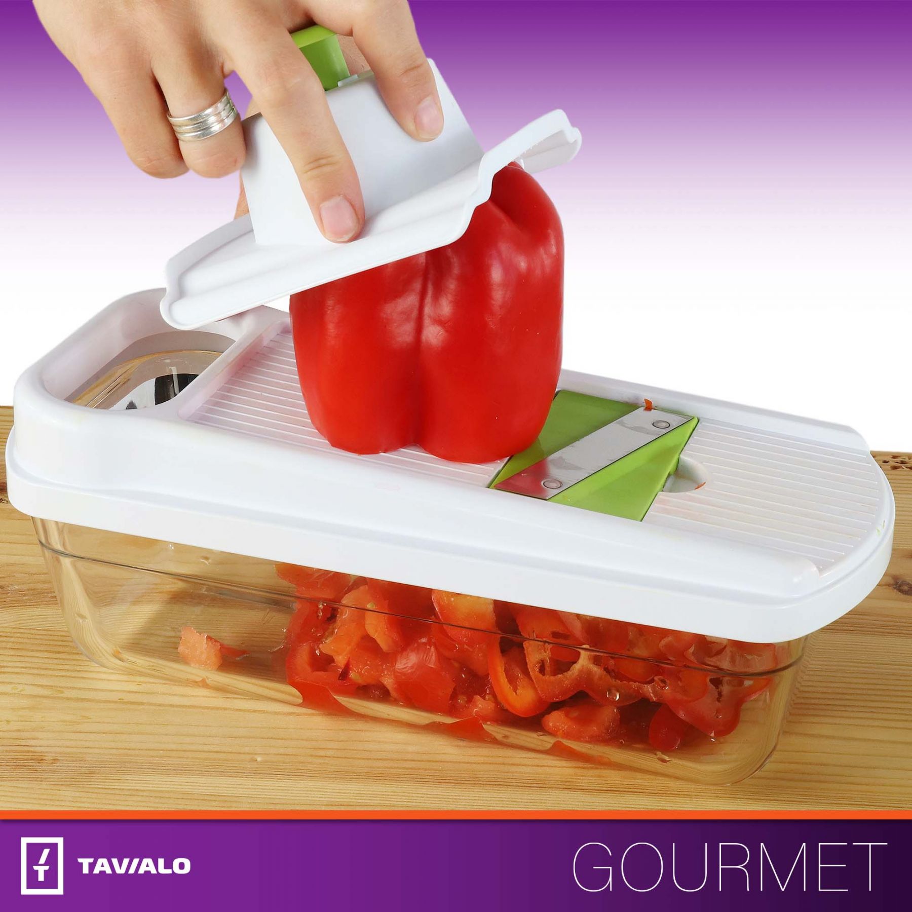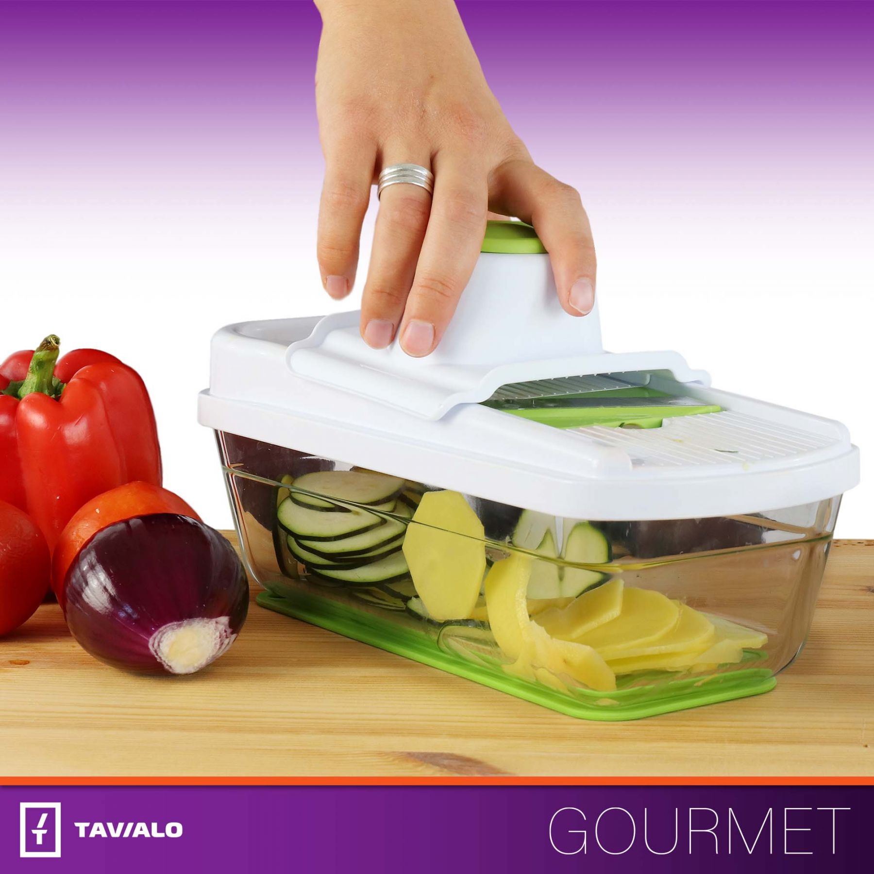 Овочерізка/терка Tavialo чудовий інструмент для вашої кухні. Важливою особливістю цього набору є скляна ємність, що робить простим процес приготування їжі. Овочерізка допомагає готувати картоплю фрі, салати, середземноморські страви, соуси тощо. Терка ідеально підходить для нарізки скибочок, тертя сиру, чіпсів з кабачків тощо. Скляна ємність ідеально підходить для запіканок, гратин та страв всіх видів. Всі кроки можна робити в одній ємності - готуйте, печіть та подавайте. Скляна чаша підходить для приготування в духовках до 400°C та для заморозки до -18°C.