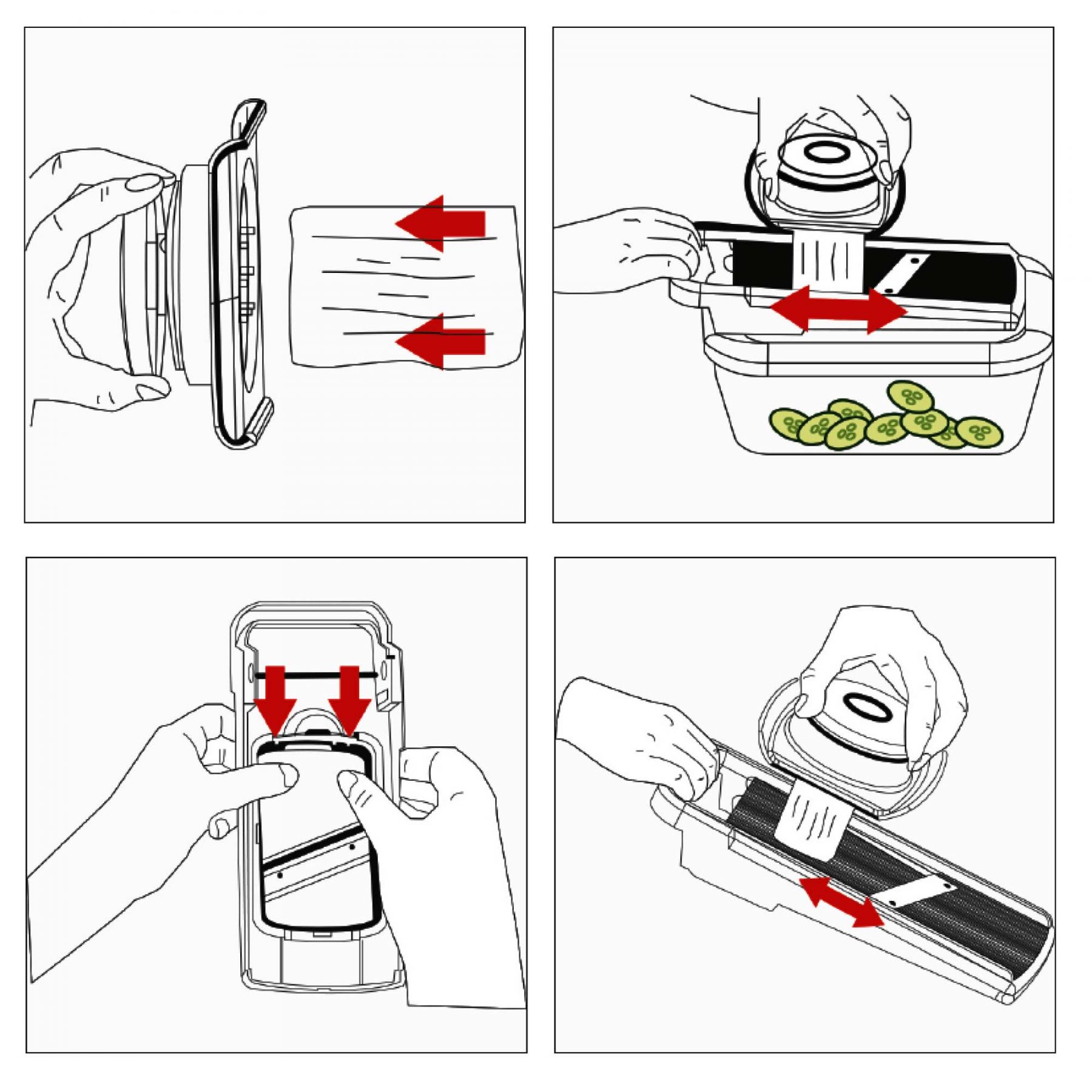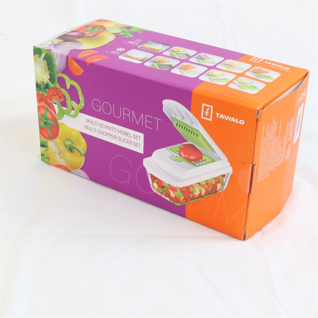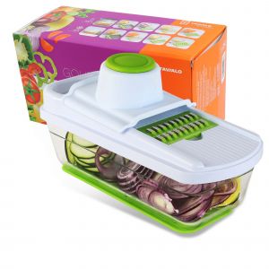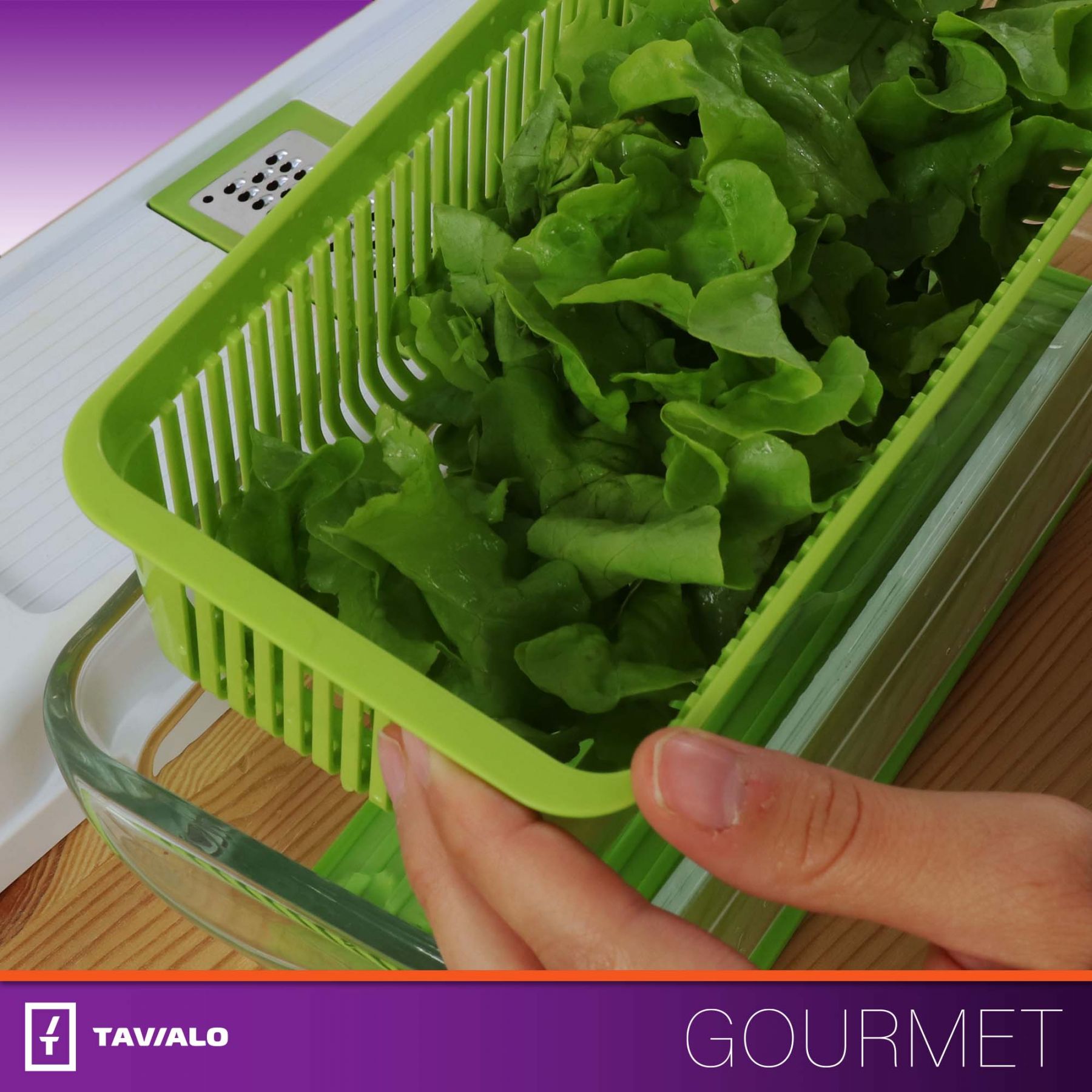 Овочерізка/терка Tavialo чудовий інструмент для вашої кухні. Важливою особливістю цього набору є скляна ємність, що робить простим процес приготування їжі. Овочерізка допомагає готувати картоплю фрі, салати, середземноморські страви, соуси тощо. Терка ідеально підходить для нарізки скибочок, тертя сиру, чіпсів з кабачків тощо. Скляна ємність ідеально підходить для запіканок, гратин та страв всіх видів. Всі кроки можна робити в одній ємності - готуйте, печіть та подавайте. Скляна чаша підходить для приготування в духовках до 400°C та для заморозки до -18°C.