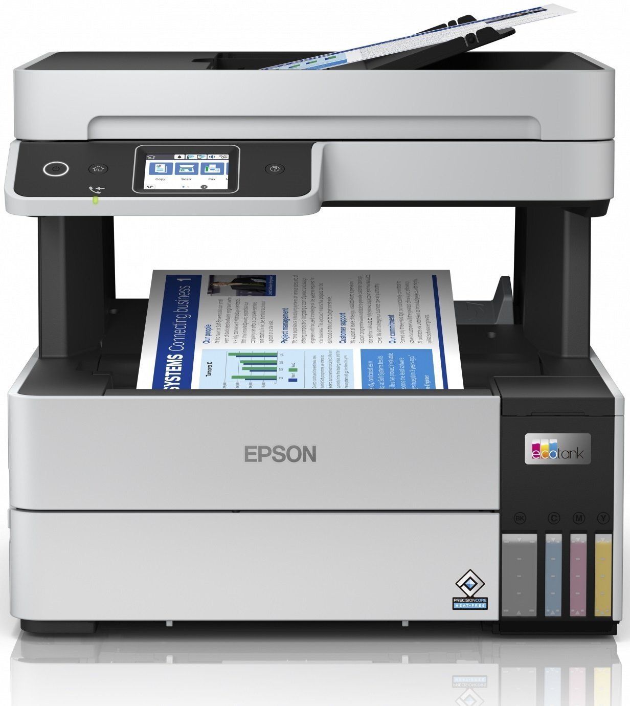 Особливість усіх пристроїв серії "Фабрика друку Epson" - це друк без картриджів. Замість картриджів Epson L6490 використовує передні чорнильні ємності. Фронтальне розташування ємностей робить пристрій компактнішим і забезпечує зручне відстеження рівня чорнила.