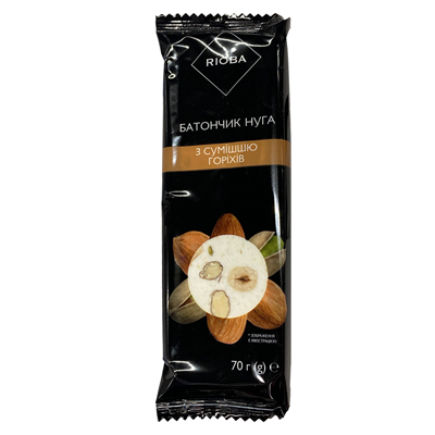 Батончик нуга Rioba з сумішшю горіхів. Продукт готовий до вживання.