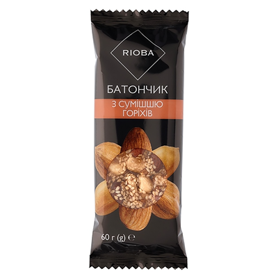 Батончик Rioba з сумішшю горіхів. Продукт готовий до вживання.
