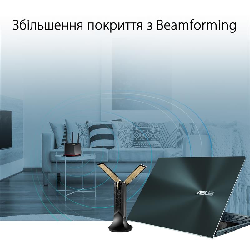 USB-AX56 — це дводіапазонний адаптер стандарту Wi-Fi 6 з конфігурацією антен 2x2, який дозволяє у повній мірі розкрити можливості маршрутизаторів цього стандарту. Він забезпечує чудову швидкість передачі даних: до 1201 Мбіт/с у діапазоні 5 ГГц і до 574 Мбіт/с у діапазоні 2,4 ГГц. Загальна швидкість складає 1800 Мбіт/c, оскільки обидва частотні діапазони можуть використовуватися одночасно. Таким чином, USB-AX56 працює в 1,5 раза швидше, ніж адаптер Wi-Fi 5!