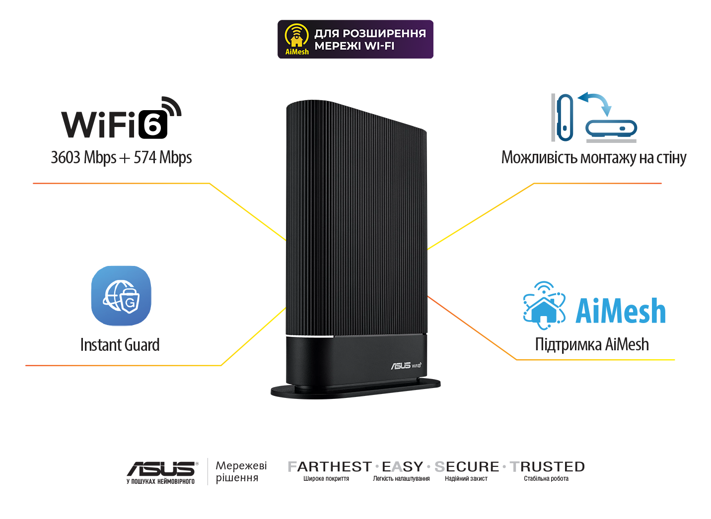 Дводіапазонний маршрутизатор класу AX4200: стандарт Wi-Fi 6 (802.11ax), підтримка технології AiMesh, система інформаційного захисту AiProtection Pro, функції Safe Browsing, Instant Guard та VPN, засоби батьківського контролю, легке налаштування, настінне кріплення. Wi-Fi для розумного дому – маршрутизатор стандарту Wi-Fi 6 на базі 4-ядерного процесора, який підтримує велику кількість одночасно підключених пристроїв і забезпечує швидкість обміну даними до 4200 Мбіт/с. Естетичний і практичний дизайн – інноваційна підставка для настільного й настінного кріплення та ультрамінімалістичний дизайн, завдяки якому пристрій впишеться у будь-який інтер’єр.