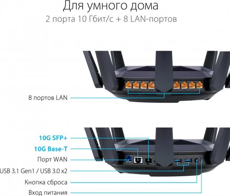 RT-AX89X обладнаний двома портами 10 Gigabit Ethernet (один — Base-T, другий — SFP+), у такий спосіб він підтримує під'єднання на швидкості до 10 Гбіт/с як через оптоволоконний, так і через мідний кабель. Це дає змогу використовувати максимально швидкі канали під'єднання до ISP, а також реалізувати високошвидкісне під'єднання ПК до NAS у власній локальній мережі стандарту 10G.