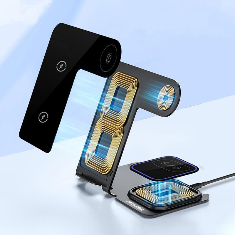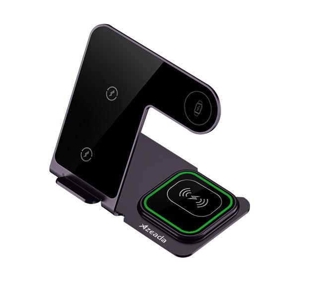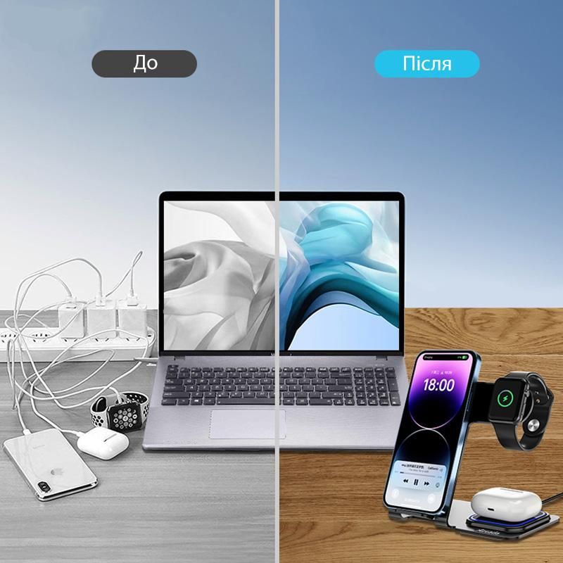 Складна станція бездротової зарядки Proda Azeada Metal 15 Вт 3 in 1 PD-W19 для iPhone/iWatch/AirPods. Бездротова зарядка дозволяє одночасно заряджати iPhone та Apple Watch та AirPords в одному місці, використовуючи бездротову технологію заряджання. Пристрій виготовлений з алюмінію та якісного пластику, який не нагрівається через довгий час роботи.