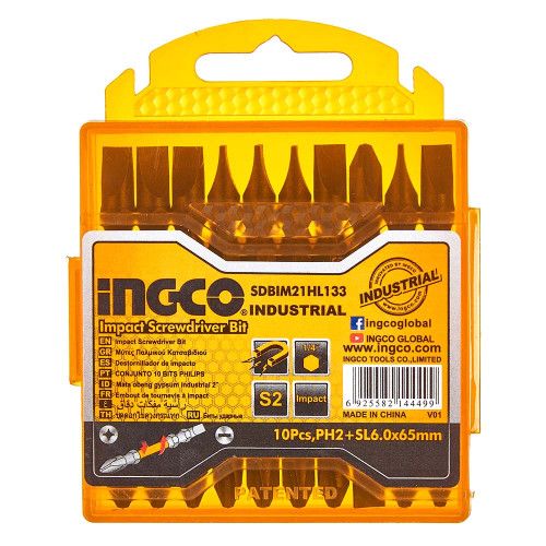 Комплект двосторонніх ударних біт PH2 + SL6 10 шт INGCO SDBIM21HL133 INDUSTRIAL з шестигранником поставляється в пластиковому футлярі. Матеріал: сталь S2. Розмір: 65 мм. Шліц: PH2 + SL6.