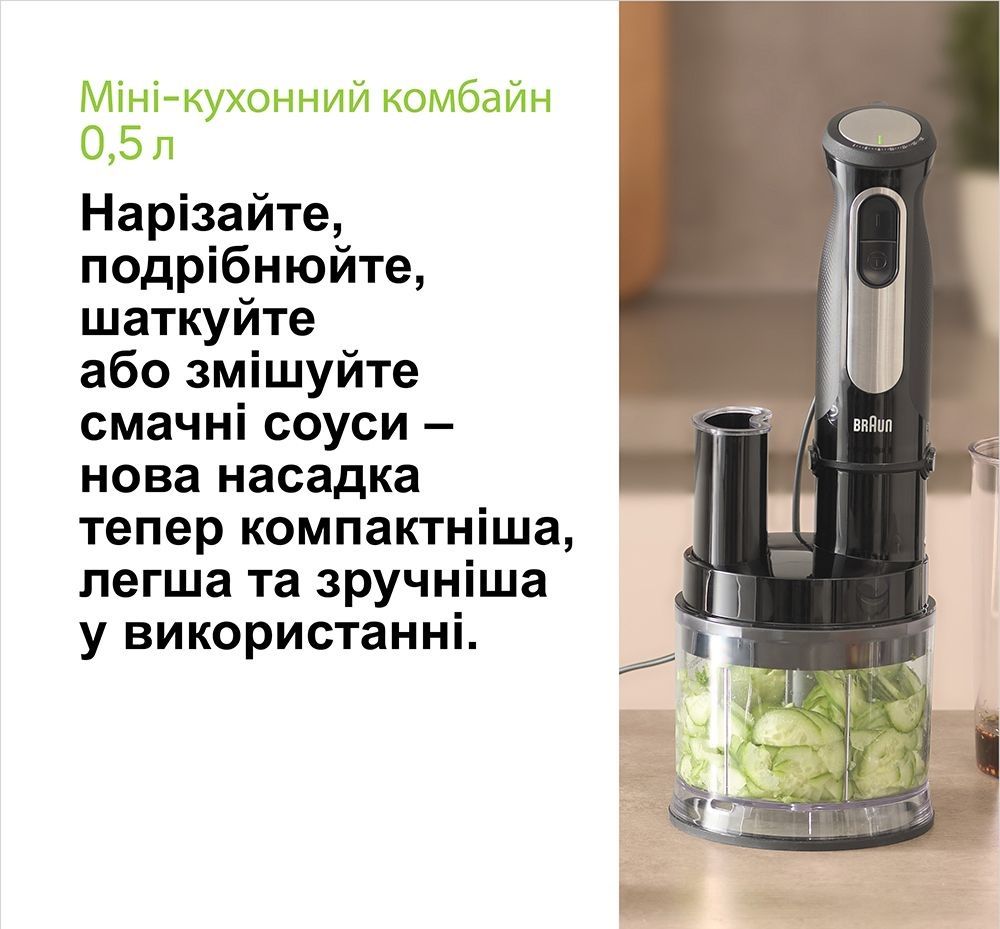 Менший, легший і надзвичайно простий у використанні. З новим кухонним міні-комбайном (0,5 л) ви можете заощадити простір не жертвуючи функціональністю.