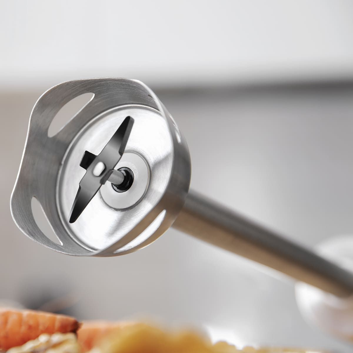 Довга ніжка XL для більшої досяжності та комфорту при приготуванні страви дозволяє змішувати як у великих каструлях і навіть у високих склянках. Крім того, занурювальний блендер гарантує чистоту на кухні, запобігаючи попаданню бризок на кухонну поверхню.