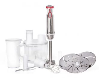 Модель укомплектована: об’ємним мірним стаканом 600 мл (з кришкою), великою чашею (1750 мл) вінчиком для збивання та насадкою з нержавіючої сталі. Подрібнюйте та змішуйте інгредієнти для створення улюблених страв і закусок за лічені секунди.