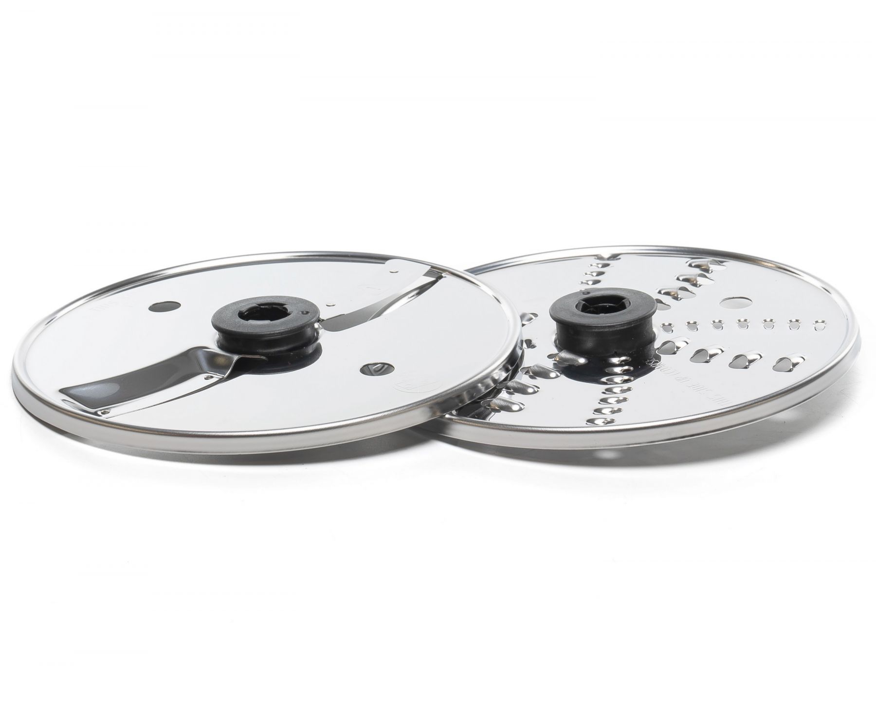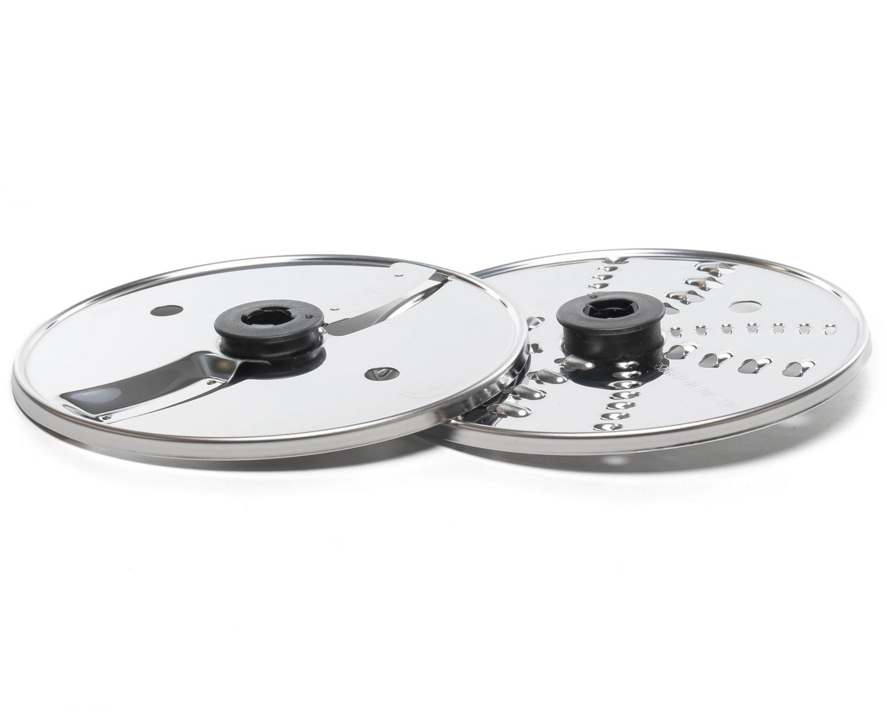 Комплектація:блендер, ніжка блендера з ножем, насадка для пюре, ніж для подрібнення (обробки трав, горіхів, сиру, шоколаду та цибулі), 2 двосторонні диски для шинкування: крупної та тонкої нарізки, диск-терка для дерунів, вінчик для збивання