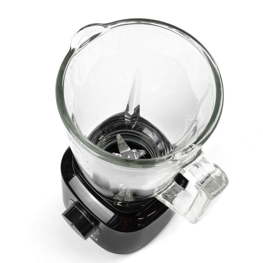 Містка чаша об’ємом 1,5 л із міцного скла, має шкалу наповнення та знімну захисну кришку з отвором, що дає можливість додавати інгредієнти прямо в процесі приготування. У скляній ємності за пару хвилин можна приготувати соуси, супи чи напої для всієї компанії.