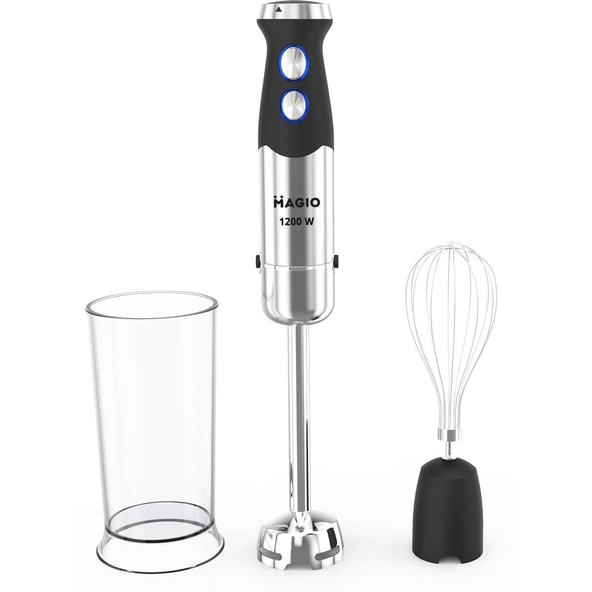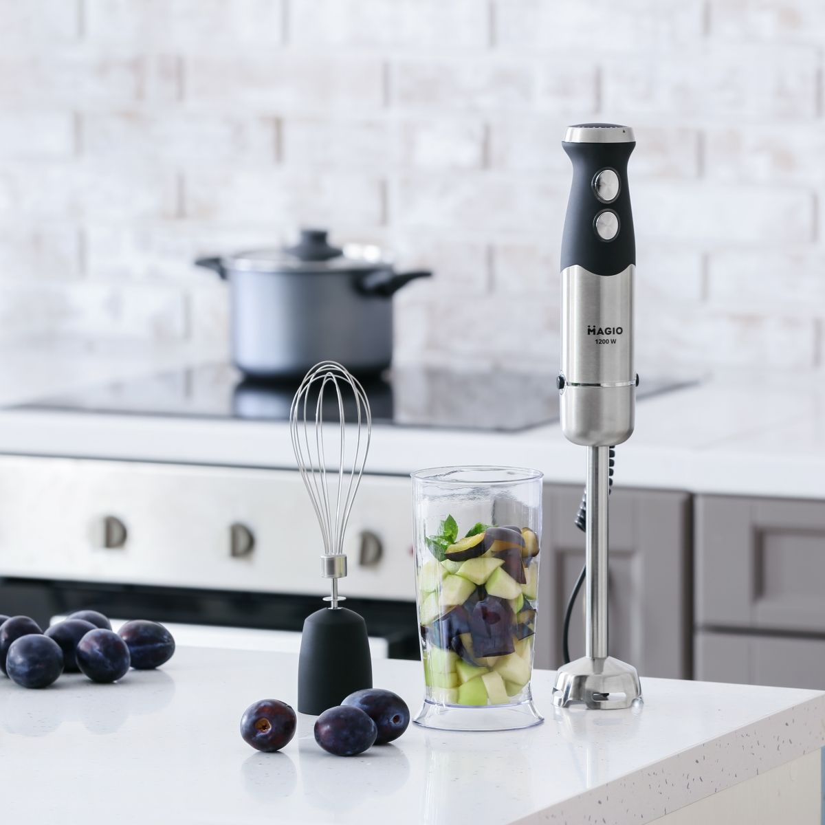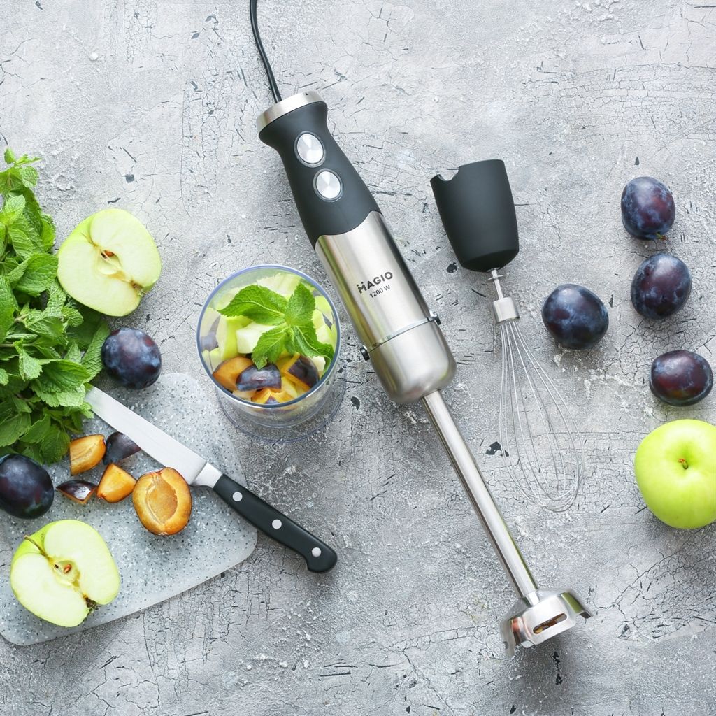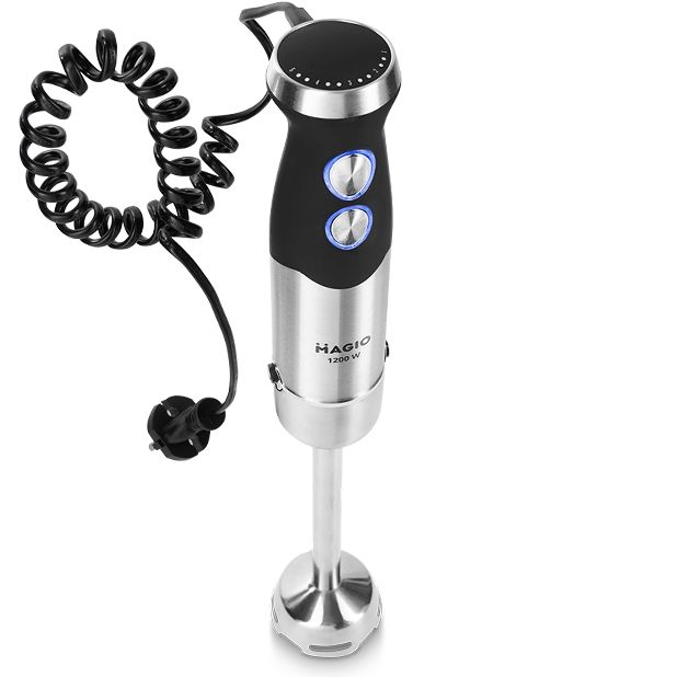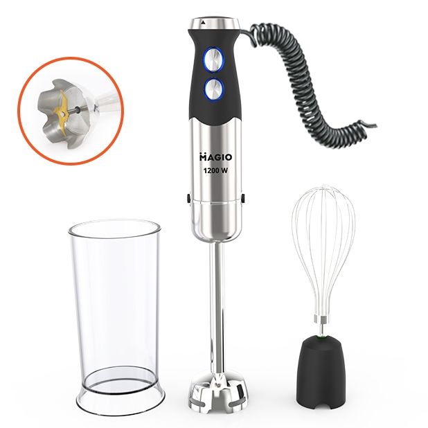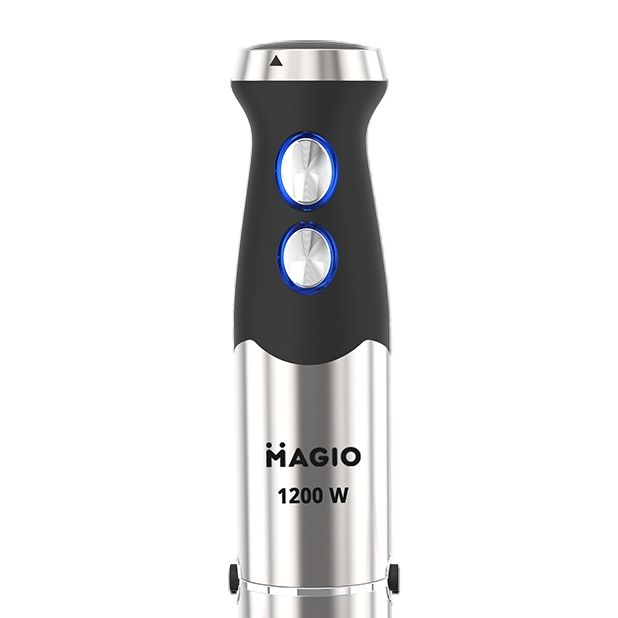 Блендерний набір MG-645 дозволить різноманітнити ваше меню та приготувати новий кулінарний шедевр. Потужність блендера становить 1200 Вт, що забезпечує безшумну ефективну роботу протягом тривалого часу. Занурювальна частина виконанана з нержавіючої сталі, а ніж з титановим покриттям – запорука стійкості до зношування і довговічності. Ергономічний держак з приємним покриттям SOFT TOUCH. Блендер може працювати на 13 швидкостях, що плавно перемикаються. Перемикач знаходиться на держаку приладу, що дуже зручно. До комплекту входять віничок для збивання та пластиковий мірний стаканчик об’ємом 600 мл. Ці властивості в поєднанні з компактним дизайном роблять блендер незамінним помічником на вашій кухні.