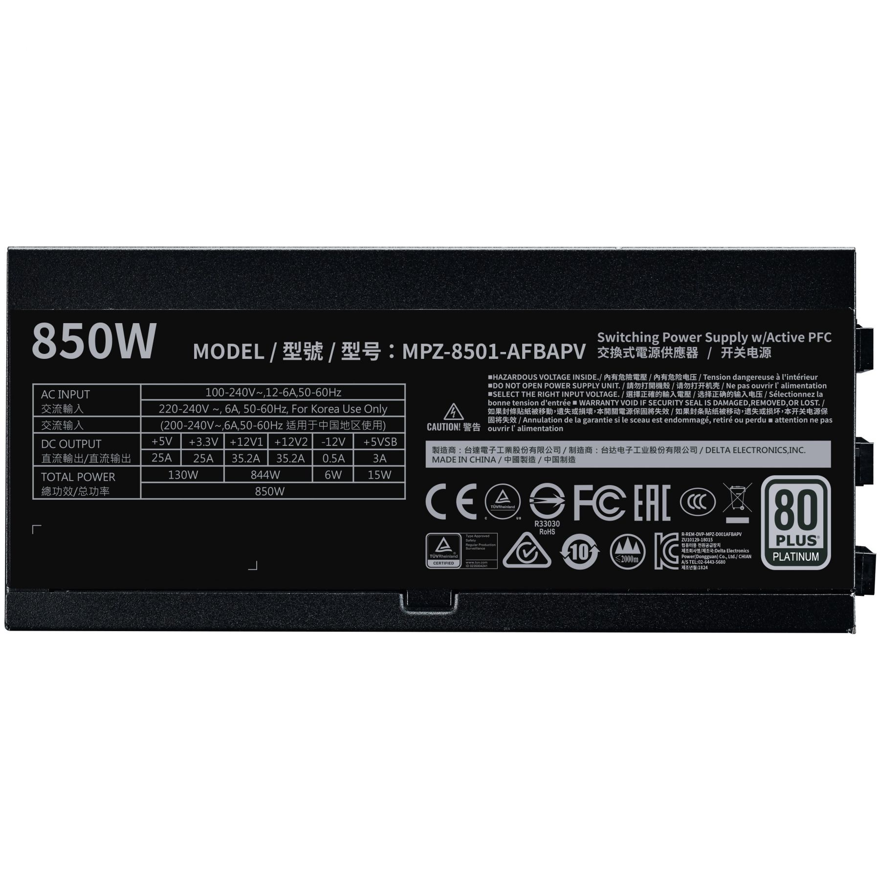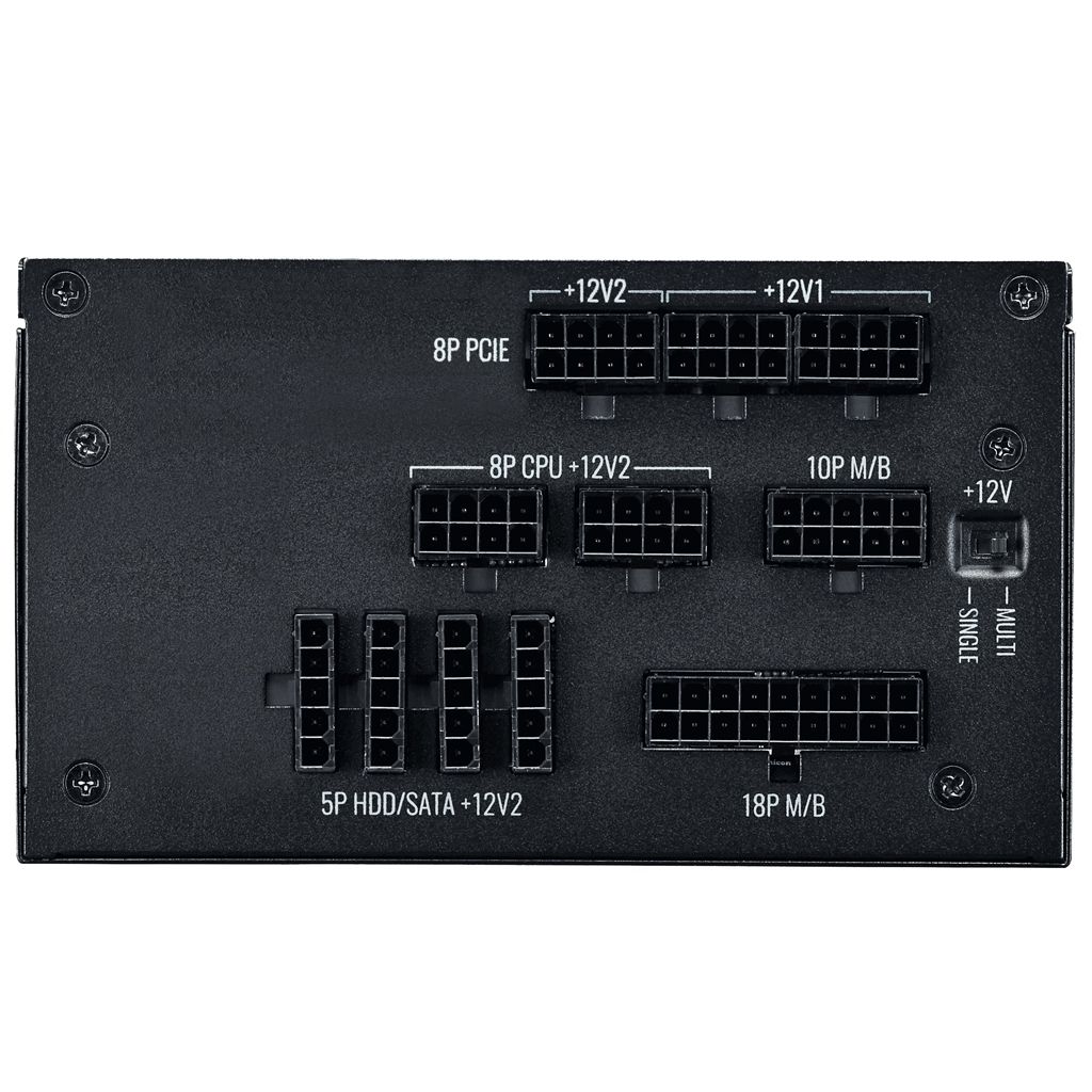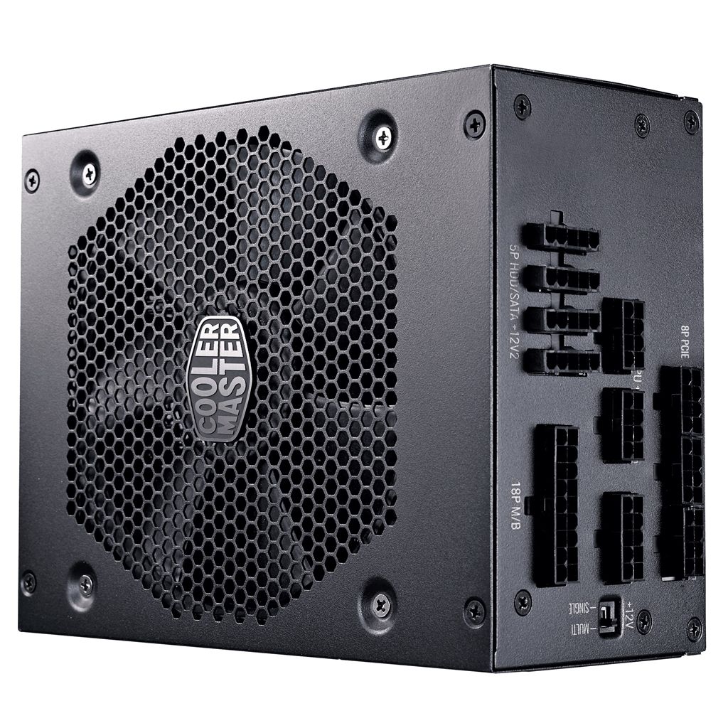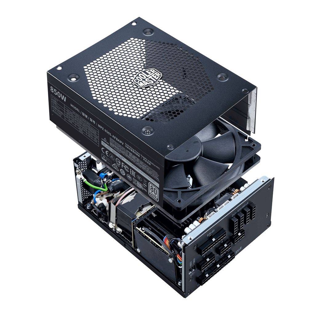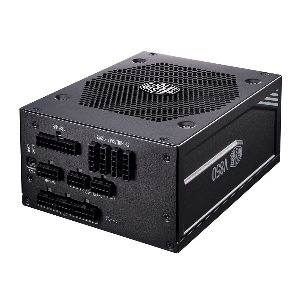 Блок живлення CoolerMaster V850 Platinum має сертифікат ефективності 80 PLUS Platinum, повністю модульну кабельну розводку, 100% японські конденсатори, робочу температуру 50 ° C і одноканальний / багатоканальний перемикач. 135-мм вентилятор використовує подвійний шарикопідшипник.