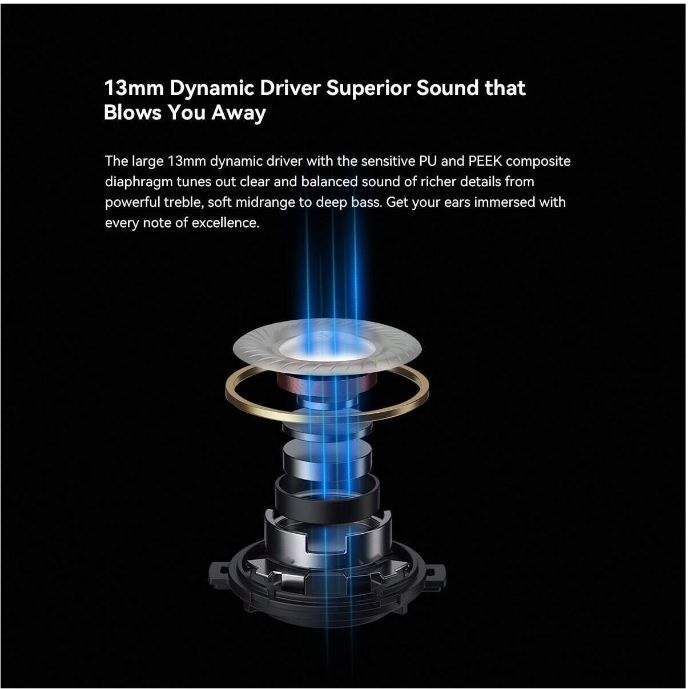 Hi-Fi якість звуку та шумозаглушення: щоб бездротові беруші звучали добре, важливо, щоб вони працювали з гарною динамічною котушкою з титановою мембраною та трубкою посилення басів. Ми постійно вдосконалюємо наші технології, щоб зробити музику чіткішою. Високі середні частоти, тричастотний баланс, приємні високі частоти, точні середні частоти, глибокі баси, новітня технологія CVC 8.0, яка покращує якість звуку та якість зв’язку.