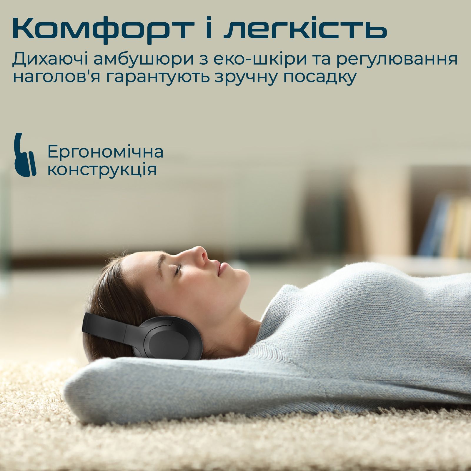 Амбушюри з еко-шкіри, що дихають, і регулювання оголов'я гарантують максимально зручну посадку.