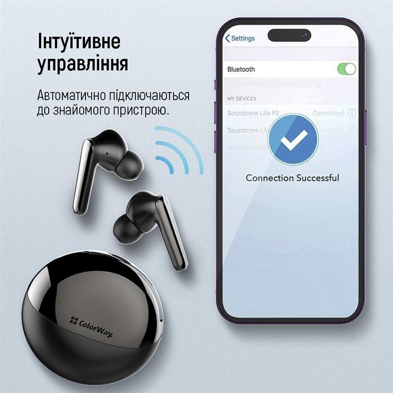 ColorWay бездротові навушники-гарнітура призначені для безперешкодного прослуховування аудіо та забезпечення зручності під час голосового зв’язку на мобільних пристроях, таких як смартфони, планшети та комп’ютери. Ці навушники забезпечують комфорт та мобільність, дозволяючи користувачеві вільно рухатися, не обтяженим дротами. Конструкція навушників гарантує відмінну ізоляцію від зовнішнього шуму та надійну посадку. Вони повністю сумісні з усіма пристроями, які підтримують технологію Bluetooth, незалежно від виробника або операційної системи. Навушники використовують передову версію Bluetooth 5.3, забезпечуючи швидке підключення, бездоганну якість та стабільність передачі аудіосигналу, а також покращену енергоефективність. Зарядження стало ще швидшим завдяки сучасному роз’єму зарядного пристрою USB Type-C. Крім того, навушники дозволяють керувати музикою та гучністю безпосередньо з них, надаючи кори