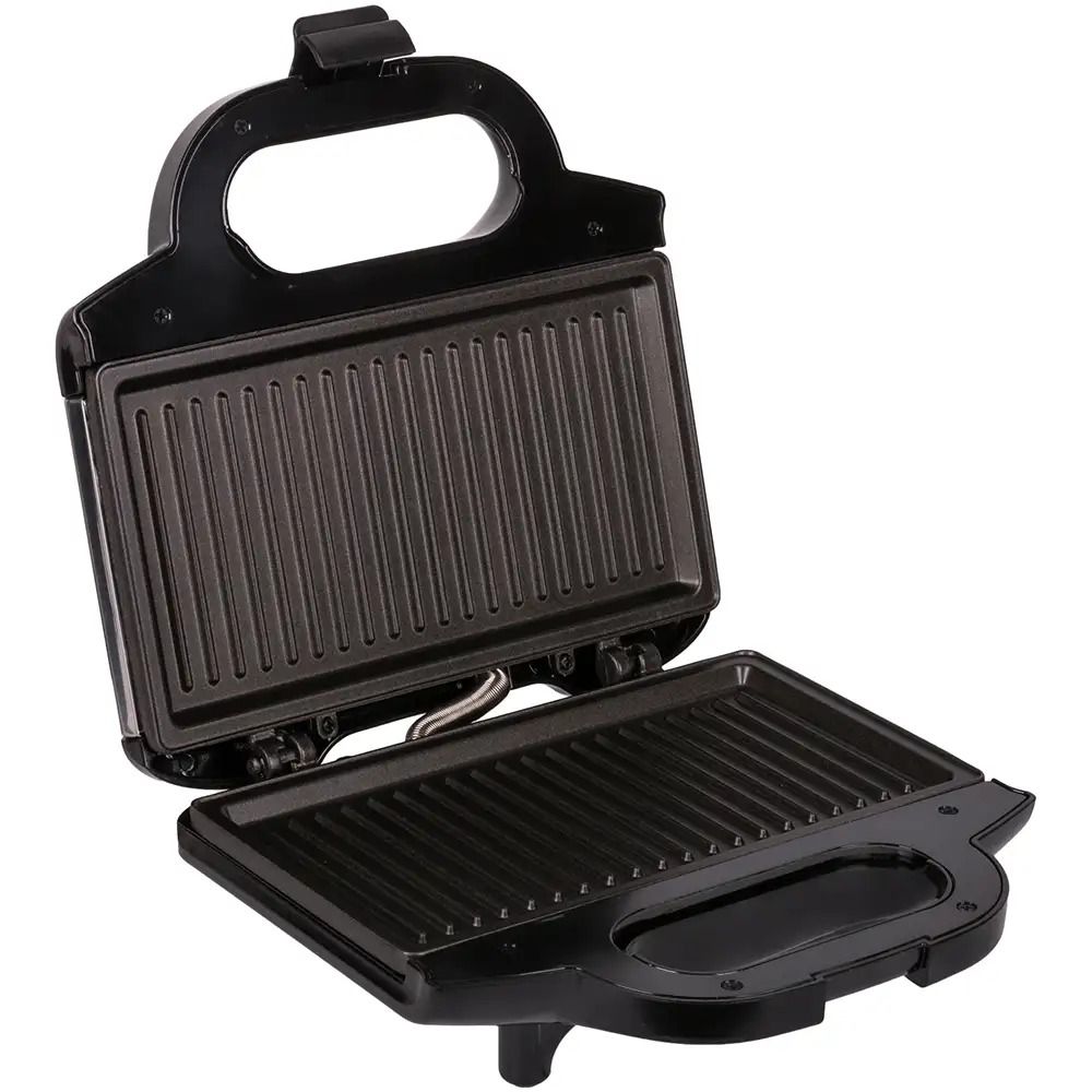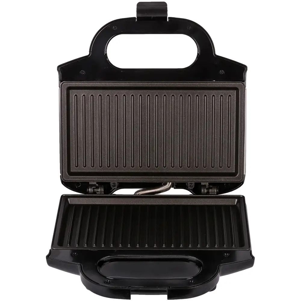 Особливості: потужність 700 Вт. Пластини для приготування гриля, сендвічів. Покриття пластин антипригарне. Матеріал пластин алюміній. Індикатор нагріву є. Індикатор готовності є. Ненагревающаяся ручка є. Можливість вертикального зберігання є. Матеріал корпусу пластик / нержавіюча сталь. Кришка з замком. Приготування бутербродів, сандвічів, Панін, сосисок і м’яса. Відсік для зберігання шнура. Нековзні ніжки.