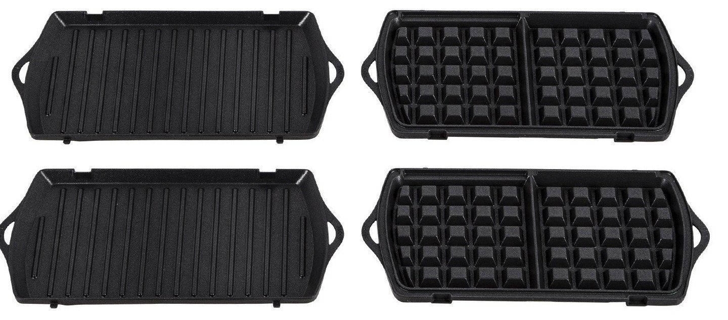 Робоча зона пристрою представлена пластинами, виготовленими з антипригарного матеріалу. Завдяки цьому їжа не прилипає і не пригорає в процесі приготування. У комплект входять пластини для приготування вафель, сендвічів і грилю.