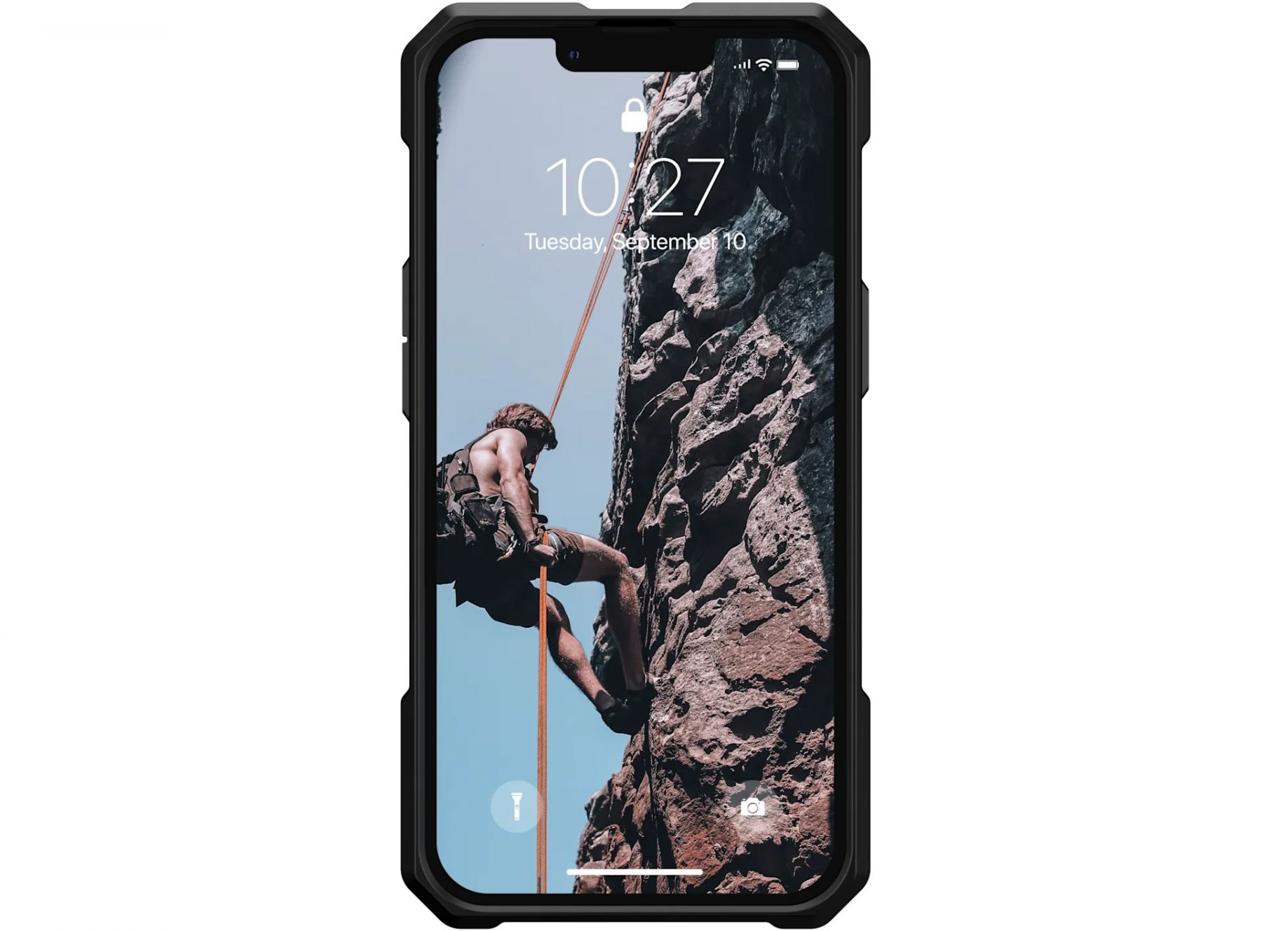 Чохол Monarch Pro MagSafe від UAG – це безкомпромісний захист від механічних загроз, включаючи не тільки подряпини та невеликі удари, але й серйозні падіння на підлогу. В його конструкції лежить багатошарове компонування, що включає: ударостійку серцевину, каркас з поліуретановим покриттям, захисну полікарбонатну пластину, металеву фурнітуру, а також еластичні силіконові елементи. Все це забезпечує максимальні амортизаційні якості, про що свідчить відповідність стандарту MIL STD 810G 516.6. Рифлена поверхня спинки та "стільникові" насічки на ребрах додатково покращують хват у руці. У конструкції враховано розташування камери та функціональних роз’ємів, для яких передбачені спеціальні вирізи, що не знижують зручності використання. Клавіші прикриваються м’якими, чутливими до натискання дублікаторами. Окремо слід відзначити наявність спеціальних магнітів, впаяних у спинку, які забезпечують підтримку технології MagSafe. З цим чохлом ви не відчуєте жодних проблем із підключенням до сумісних бездротових ЗУ.