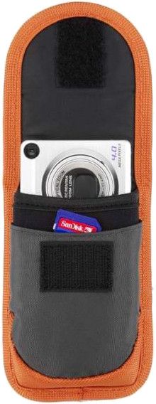 Виготовлено з водовідштовхувального нейлону та поліестеру. Неопренова прокладка для захисту компактних цифрових пристроїв. Передня кишеня для карт пам’яті та аксесуарів. Можливе перенесення на плечі, на зап’ястя та на талії.
