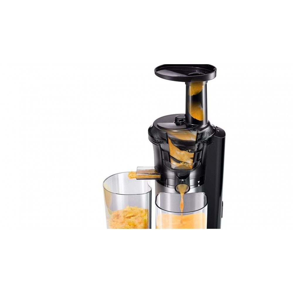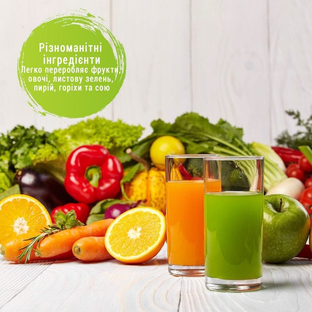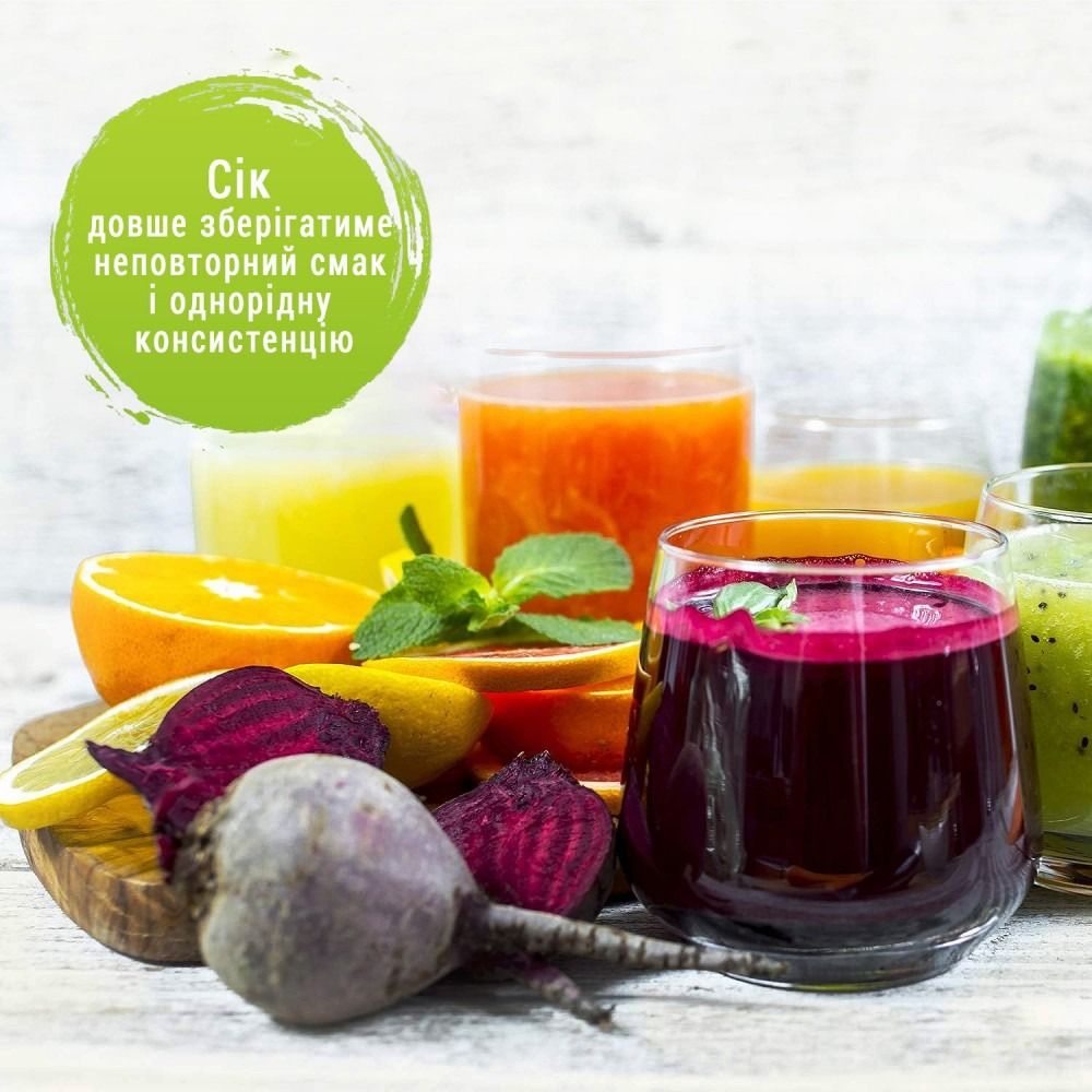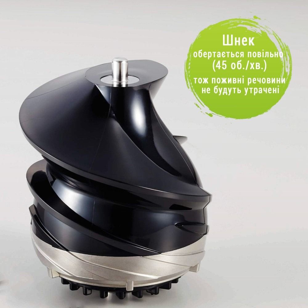 Під час вичавлювання інгредієнтів шнек обертається повільно. Корисні речовини не будуть втрачені внаслідок нагрівання та окислення під час тертя, як у звичайних соковитискачах. Можливість зробити сік із м'яких, твердих чи заморожених інгредієнтів. Сік триваліший час зберігатиме смак і однорідну консистенцію. Вітамін С запобігає пошкодженням. Різноманітність рецептів (соки, смузі, джеми, супи, пюре тощо). Насадка для заморожених продуктів. Автоматичний очищувач, що запобігає засміченню фільтра. Кришка з носиком із функцією "Крапля стоп". Переривач ланцюга для захисту двигуна від перегріву.