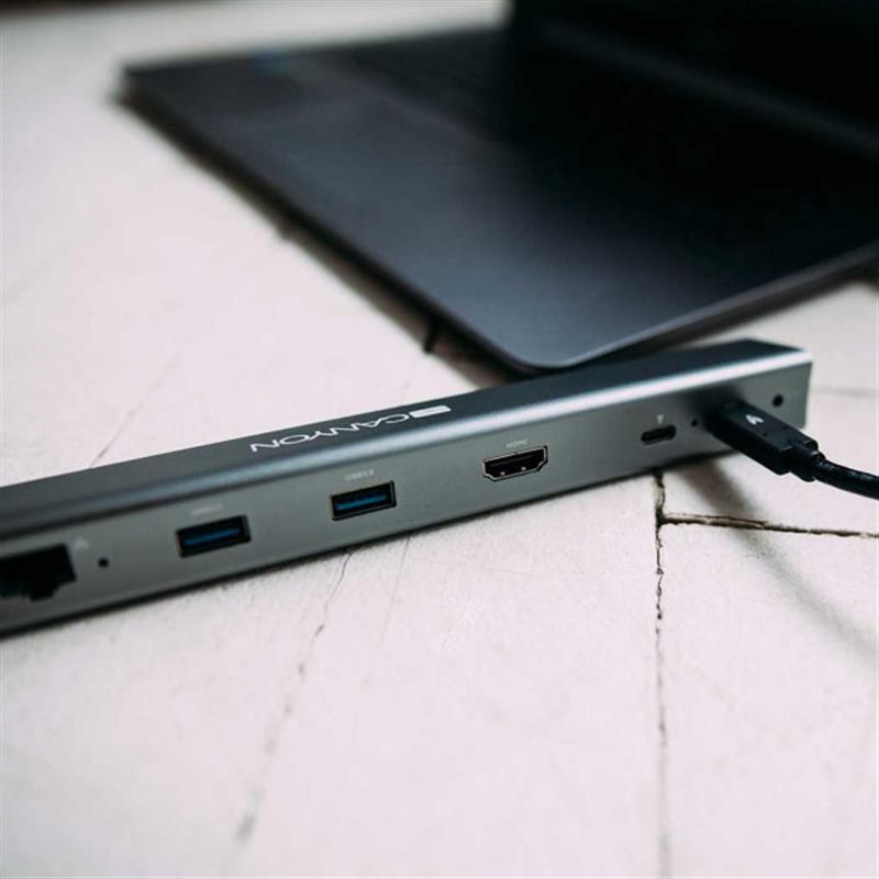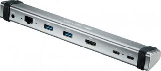В цей універсальний хаб для USB Type C включені всі роз’єми, необхідні для щоденної роботи. Він забезпечує високоякісне 4K HDMI-з’єднання з монітором, стабільне підключення по "ethernet" швидкістю в 1000 Мегабіт, швидку передачу даних по USB 3.0 Type A, комбінований аудиоканал для навушників і мікрофону і 2 гнізда USB type C для під’єднання зовнішніх пристроїв і зарядки. Стабільність підключення забезпечує якісний ПВХ-кабель, а міцний алюмінієвий корпус захищає від зовнішніх пошкоджень. Хаб можна використовувати в якості док-станції, встановивши ноутбук зверху.