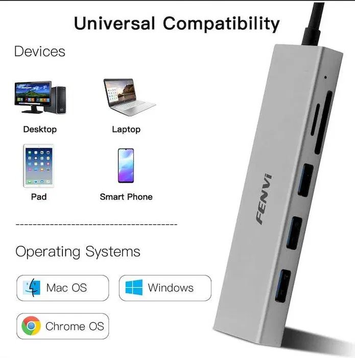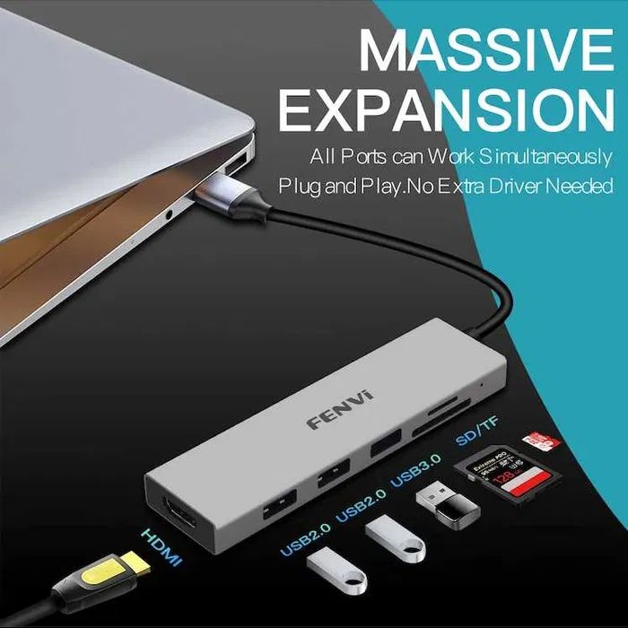 У цьому універсальному концентраторі Fenvi 6-в-1 F-C601H, Grey, Type-C є все необхідне для розширення можливостей вашого пристрою. Завдяки HDMI 2.0, 2 портам USB 2.0, 1 порту USB 3.0, передачею даних слотам для карток SD і TF підключатися до кількох периферійних пристроїв і насолоджуватися швидкою та стабільною швидкістю передачі даних.
