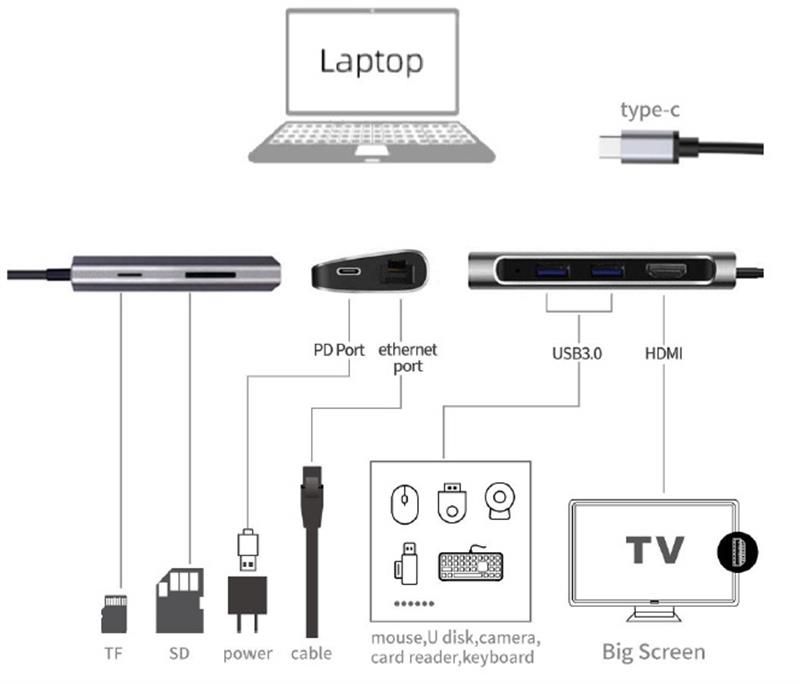 (Type C to HDMI+2*USB 3.0+PD+Lan+TF+SD)