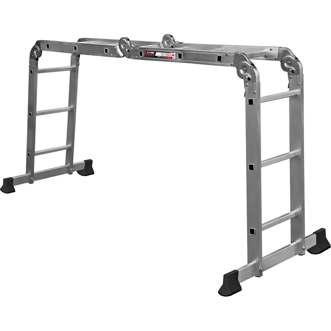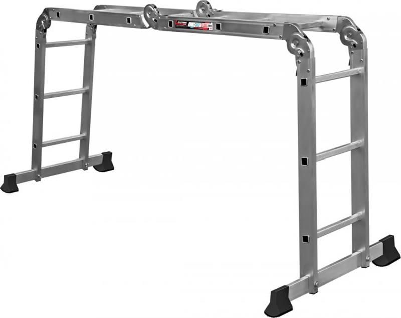 Драбина Stark 4 х 3 — виготовлена з високоміцного екструдованого алюмінієвого профілю. Це забезпечує високу жорсткість конструкції, а також здатність витримати навантаження до 150 кг. Щоб уникнути ковзання, драбини укомплектовані надійними еластичними пластиковими підошвами. Драбини мають міцні карбовані щаблі, які не дадуть нозі зісковзнути. В основі функціональності драбини лежить шарнірний механізм, за допомогою якого ви з легкістю зможете встановити драбину в потрібному вам положенні.