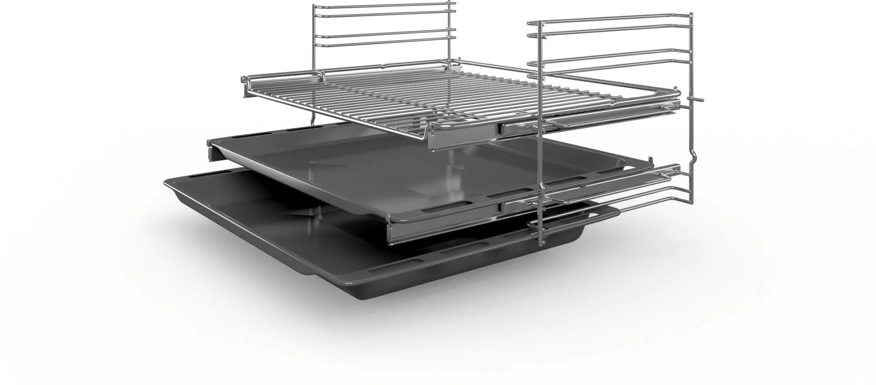 Наша система телескопічних напрямних безпечна та проста у використанні. На рівні, оснащенному телескопічними рейками, розмістити деко зі стравою набагато легше. Вам більше не потрібно тягнутися до гарячої духовки руками, аби швидкой перевірити стан приготування.
