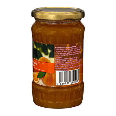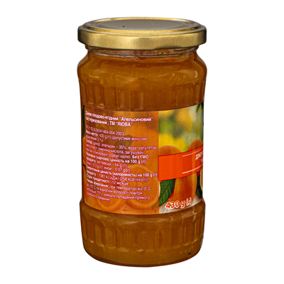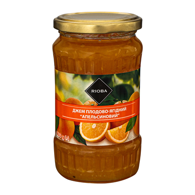 Джем Rioba Апельсиновий плодово-ягідний 430г. Склад: цукор, апельсин - 35%, вода, регулятор кислотності лимонна кислота, загущувач пектин, консервант сорбат калію. Калорійність в 100г продукту: 258 ккал. Харчова (поживна) цінність у 100г продукту: Білки - 0.3г., Жири - 0.07г., Вуглеводи - 64г. Умови зберігання: зберігати за температури від 0°C до 25°C - 12 місяців., при відносній вологості повітря не більше ніж 75% Уникати попадання прямого сонячного світла.