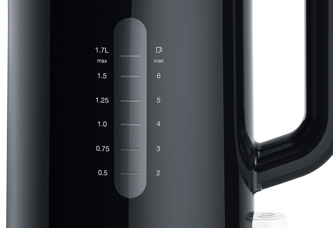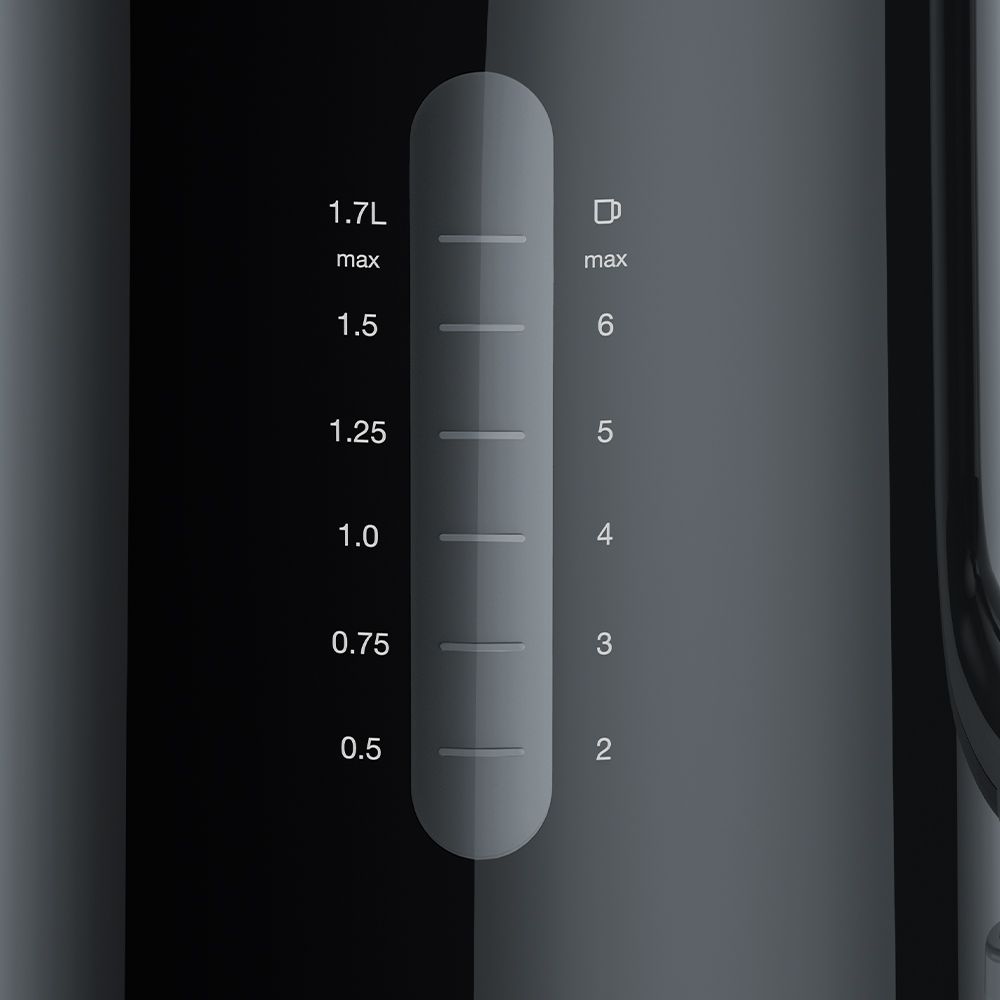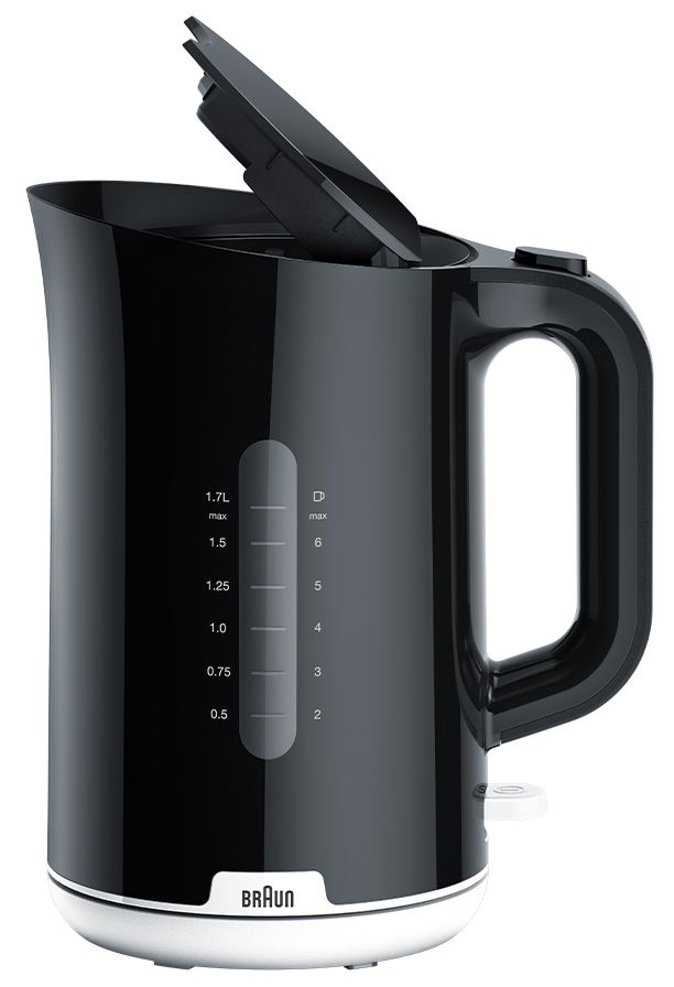 Обсяг чайника в 1,7 літрів, дозволяє закип’ятити рідина як для однієї людини, так і для цілої компанії, що б влаштувати повноцінне чаювання. Ергономічна, нековзна ручка зручно тримається в руці. Індикатор на бічній частині корпусу чайника Braun WK 1100 Black орієнтує про які залишилися об’ємі рідини. Варто відзначити так само дуже зручну поворотну основу. Завдяки її конструкції, ви можете ставити на неї чайник з будь-, зручною для вас позиції, що не переживаючи про правильність розміщення приладу для подальшого використання.