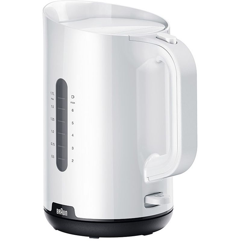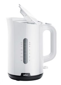 Обсяг чайника в 1,7 літрів, дозволяє закип’ятити рідина як для однієї людини, так і для цілої компанії, що б влаштувати повноцінне чаювання. Ергономічна, нековзна ручка зручно тримається в руці. Індикатор на бічній частині корпусу чайника Braun WK 1100 WH орієнтує про які залишилися об’ємі рідини. Варто відзначити так само дуже зручну поворотну основу. Завдяки її конструкції, ви можете ставити на неї чайник з будь-, зручною для вас позиції, що не переживаючи про правильність розміщення приладу для подальшого використання.