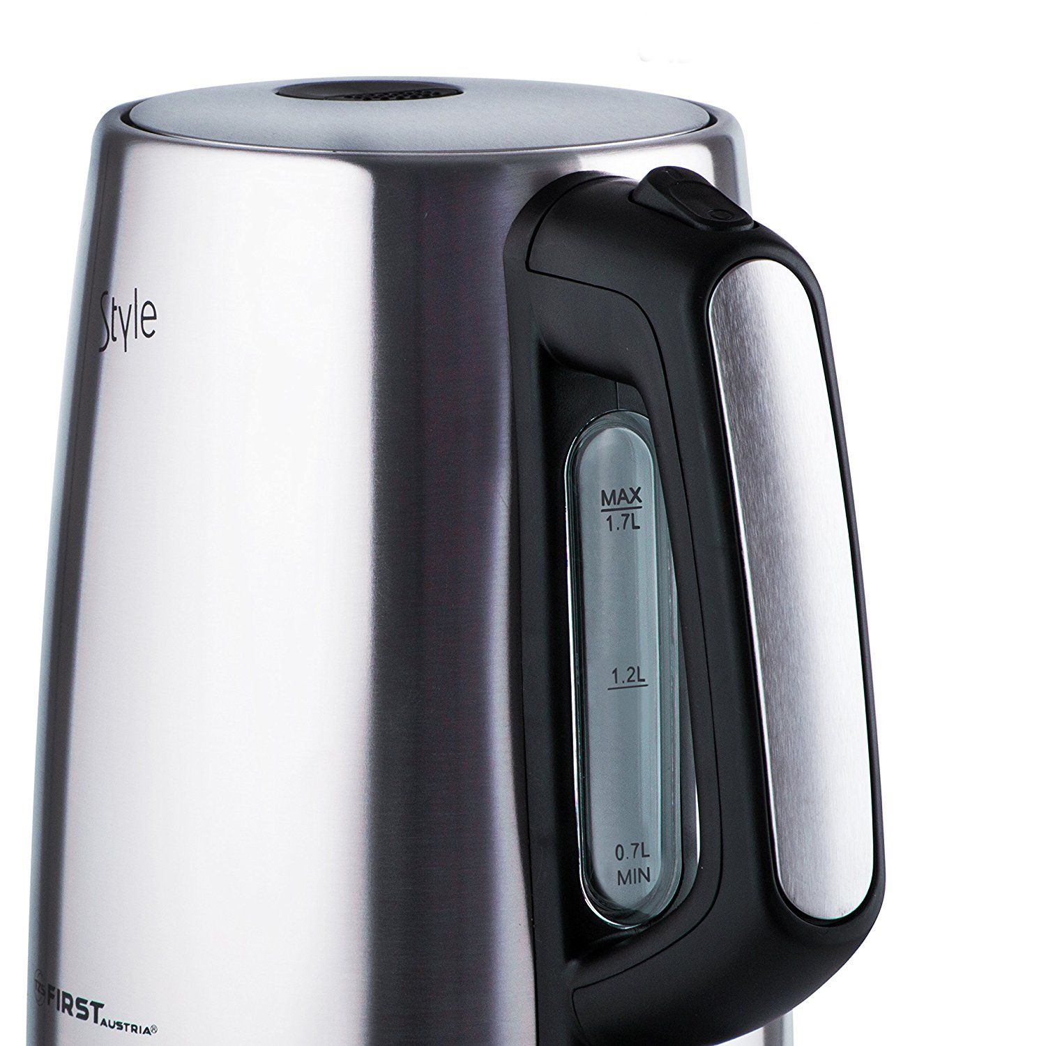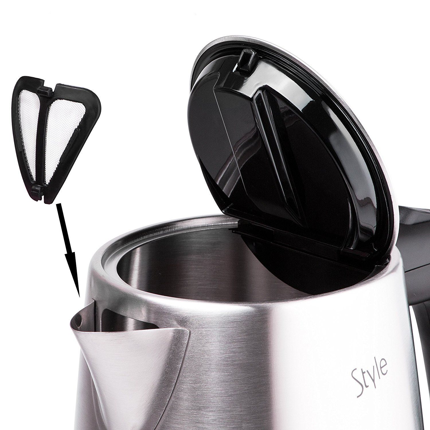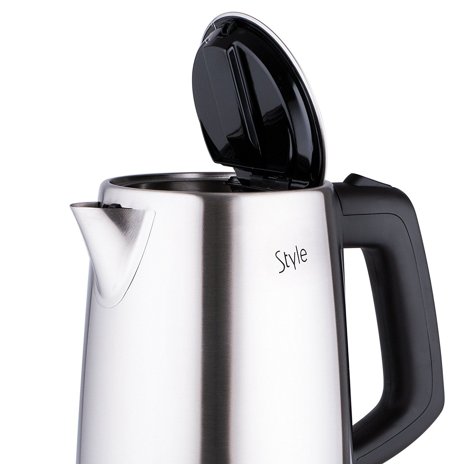 Непідвладний часу дизайн і зручний в експлуатації: бездротовий чайник з матової нержавіючої сталі завдяки гармонійному дизайну вписується як в сучасну, так і в класичну кухню. Маючи ємність 1,7 літра, він за один прийом постачає навіть великі сім’ї водою для заварювання чаю, кави, снеків для заварювання або дитячого харчування. Що вам сподобається: практичний кут установки 360 °. Це дозволяє легко розмістити глечик на станції з усіх боків. У комплект входить носик без крапель, індикатор рівня води, що легко читається, фільтр від накипу, проста у догляді основа з нержавіючої сталі з прихованим нагрівальним елементом і автоматичне відключення із захистом від википання.
