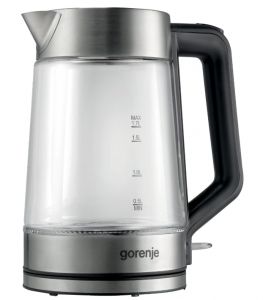 Електрочайник Gorenje K17GE виготовляється в сучасному дизайні в корпусі з нержавіючої сталі зі скляною колбою і чорною напівкруглою пластиковою ручкою.
